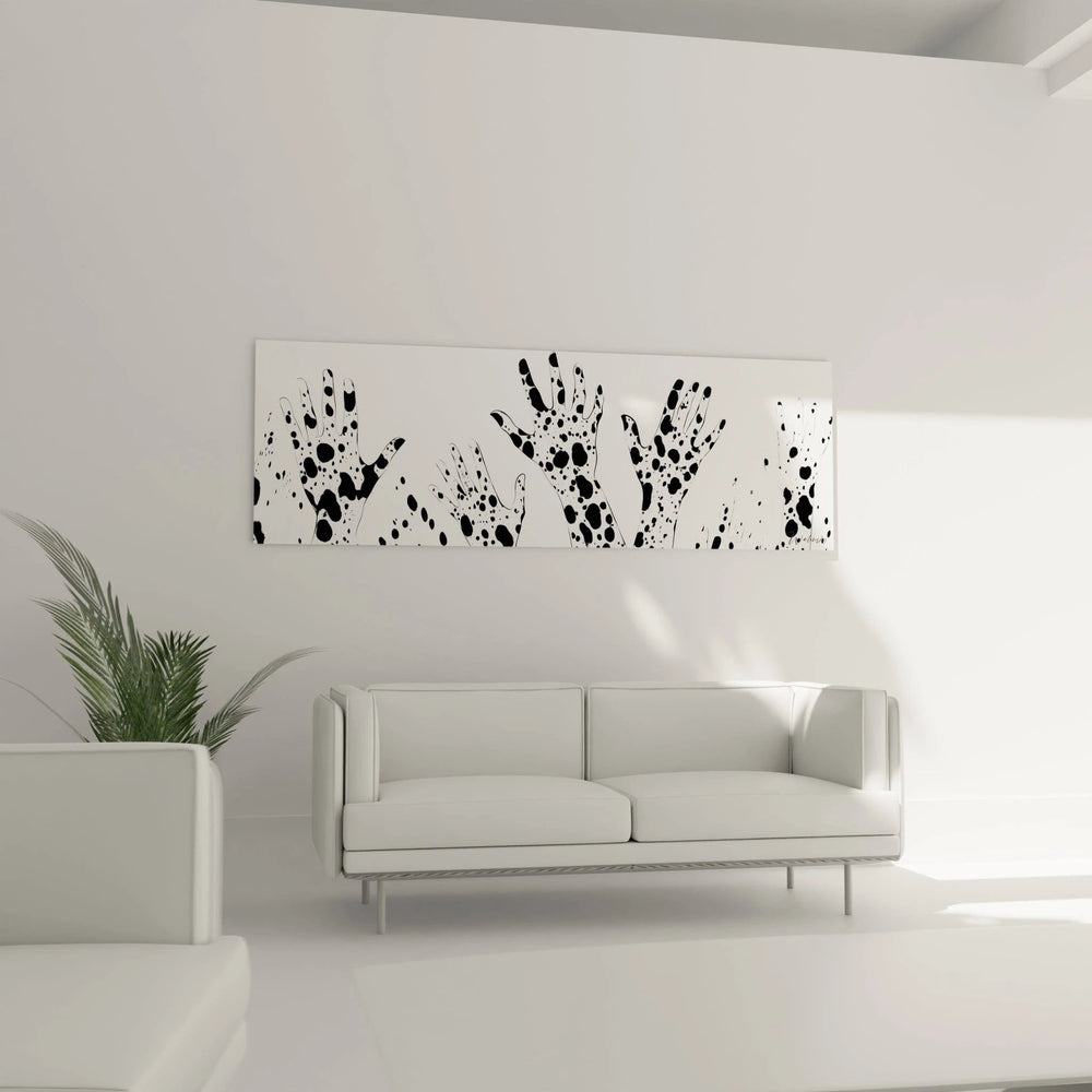 Cette œuvre mains stylisées monochrome se distingue par son approche minimaliste radical du motif de la main humaine. Les silhouettes s'élèvent dans un mouvement chorégraphié, créant un rythme visuel hypnotique. Chaque main présente des proportions légèrement différentes, conférant à l'ensemble une authenticité touchante. Le tableau mains tachées contemporain joue sur l'alternance entre pleins et vides, créant des respirations visuelles essentielles à l'équilibre général. Les formes organiques contrastent avec la géométrie du format horizontal, offrant une art mural mains graphiques d'une modernité saisissante qui s'intègre parfaitement dans les intérieurs contemporains.