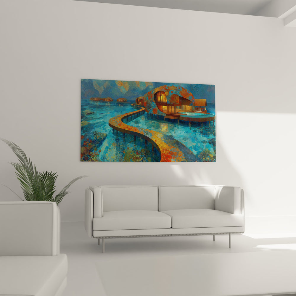 Ce tableau mural maison futuriste nous transporte dans un univers aquatique extraordinaire où l'architecture moderne se fond harmonieusement avec l'environnement océanique. L'œuvre dépeint une habitation sous-marine futuriste aux formes organiques et arrondies, baignée dans une palette de couleurs dominée par les bleus profonds et les oranges chaleureux. La structure principale présente des fenêtres illuminées qui créent un contraste saisissant avec l'obscurité des profondeurs marines. Une passerelle sinueuse, véritable pont architectural, relie différents niveaux de cette demeure aquatique moderne, créant un parcours fluide et élégant. L'artiste a magistralement intégré des éléments de corail stylisé et de végétation marine qui semblent faire partie intégrante de l'architecture. Les reflets dorés sur les surfaces métalliques de la construction ajoutent une dimension luxueuse à cette vision architecturale sous-marine. Cette œuvre d'art moderne évoque un futur où l'humanité aurait appris à vivre en parfaite symbiose avec l'océan, transformant les fonds marins en espaces habitables sophistiqués. La technique picturale mélange réalisme architectural et impressionnisme aquatique, créant une atmosphère onirique qui invite à l'évasion et à la contemplation de possibles futurs.
