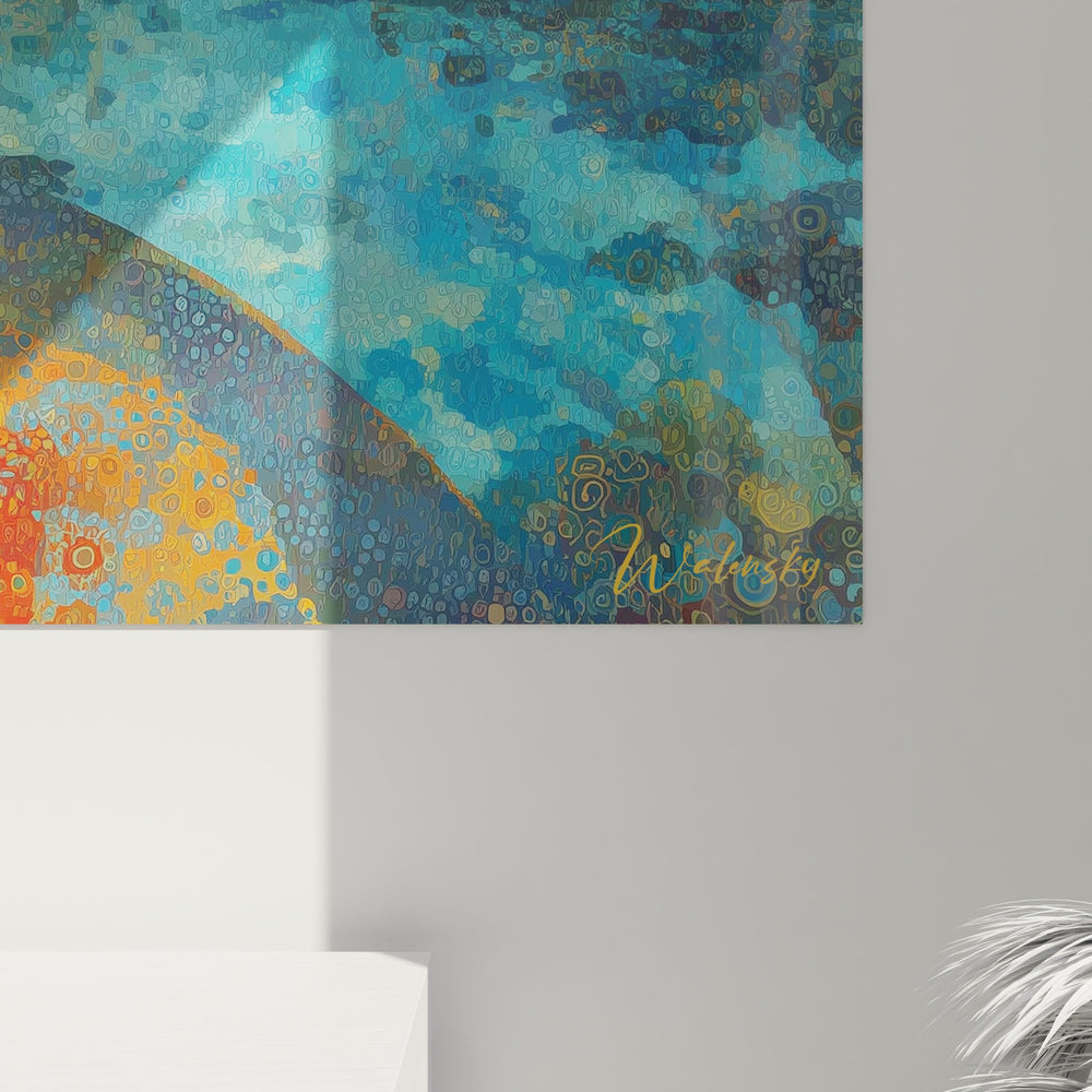 Imaginez-vous plongé au sein des profondeurs marines, entouré par la beauté sereine des îles et des archipels. Les nuances vibrantes de bleu et d'émeraude, harmonieusement mélangées à des teintes dorées, portent un souffle d'air frais à votre décoration. Ce tableau n'est pas seulement une image, c'est une fenêtre vers un nouvel univers où chaque regard vous rappelle la tranquillité et l'émerveillement de l'océan.