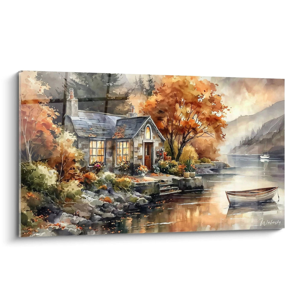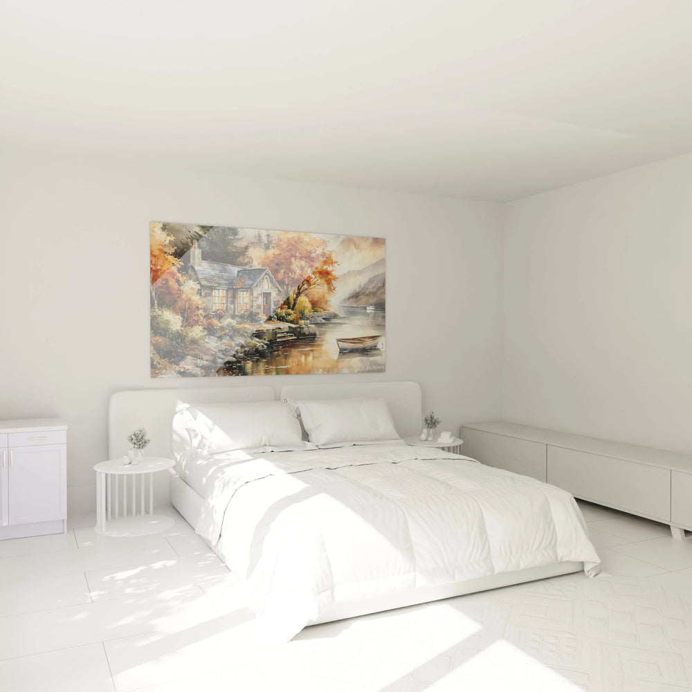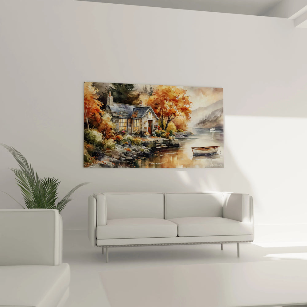 Ce tableau maison lac automne révèle une composition exceptionnelle mêlant architecture rustique et paysage naturel flamboyant. La demeure aux murs de pierre grise s'élève majestueusement au bord de l'eau, ses fenêtres dorées illuminant la scène d'une chaleur réconfortante. Les décoration murale maison lac de cette qualité captent immédiatement l'attention par leur équilibre parfait entre éléments architecturaux et végétation automnale. Une barque de bois flotille paisiblement au premier plan, créant une perspective invitante vers cette habitation idyllique. L'ensemble dégage une atmosphère de sérénité absolue, où chaque détail contribue à l'harmonie générale de cette œuvre maison lac atmosphérique.