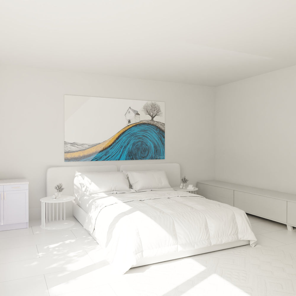 Ce tableau mural maison spirale présente une composition artistique saisissante où une petite maison blanche se dresse fièrement au sommet d'une colline aux courbes hypnotiques. L'œuvre développe un concept visuel unique autour d'une spirale abstraite bleue qui transforme le paysage en vague ondulante, créant un effet de mouvement perpétuel. La décoration murale spirale révèle un arbre dénudé aux branches délicates qui accompagne la maison dans cette danse cosmique. Les lignes tourbillonnantes de la spirale évoquent les forces naturelles invisibles, comme si la terre elle-même était animée d'une énergie mystérieuse. Ce tableau spirale abstrait joue magistralement avec les perspectives, transformant un paysage rural traditionnel en vision onirique. La technique de dessin mélange habilement le réalisme architectural de la maison avec l'art abstrait géométrique de la spirale, créant une harmonie visuelle captivante. L'artiste a su maîtriser l'équilibre entre stabilité et mouvement, ancrant les éléments fixes comme la maison et l'arbre sur une base mouvante qui défie les lois de la physique. Cette œuvre d'art murale invite à la contemplation et à l'évasion, transformant n'importe quel espace en fenêtre vers un monde imaginaire où la réalité se mélange aux rêves.