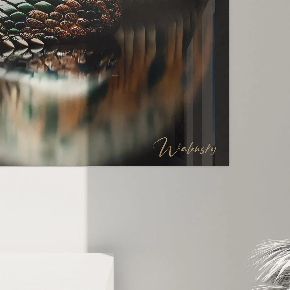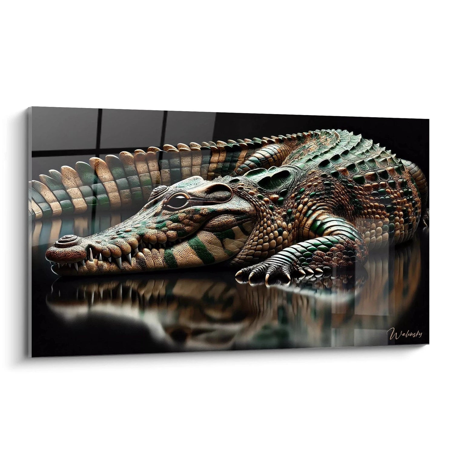 La palette subtile de verts profonds, d’éclats bronze et de nuances beiges crée une harmonie visuelle à la fois chaleureuse et raffinée. Cette combinaison évoque la symbiose entre la terre et l’eau, renforçant la dualité symbolique de l’animal. Chaque écaille rend hommage à la beauté rugueuse et complexe de ce prédateur majestueux, donnant vie à la toile grâce à un travail précis sur les textures et la lumière.