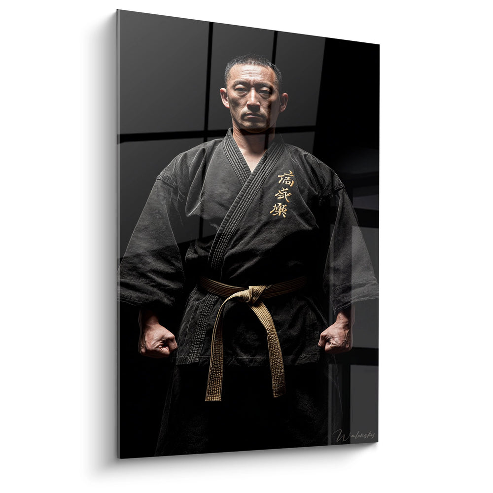 Cette œuvre s'inscrit dans la tradition des portraits de maîtres d'arts martiaux, rappelant les photographies de grands sensei comme Gichin Funakoshi. Elle complète parfaitement une collection dédiée au karaté traditionnel et aux valeurs martiales japonaises.