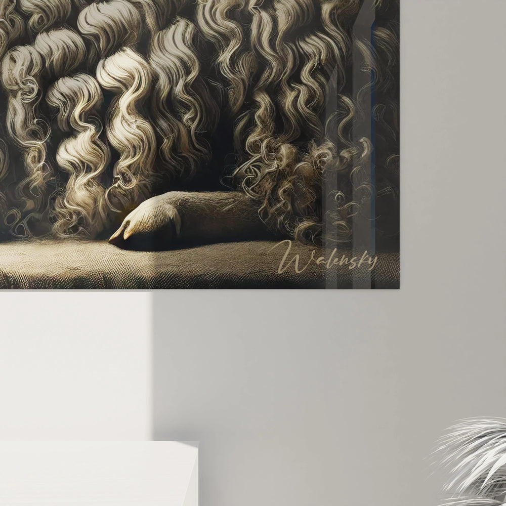 Ce tableau se distingue par son jeu d’ombres et de lumières, venant délicatement caresser chaque boucle du pelage, révélant une texture riche et vivante. La lumière dorée, discrète mais enveloppante, fait ressortir la douceur de la laine et crée un contraste élégant avec un fond sombre enveloppant. Cette composition inspire un sentiment de calme presque méditatif, comme si ce gardien silencieux veillait sur votre espace, apportant paix et sérénité.