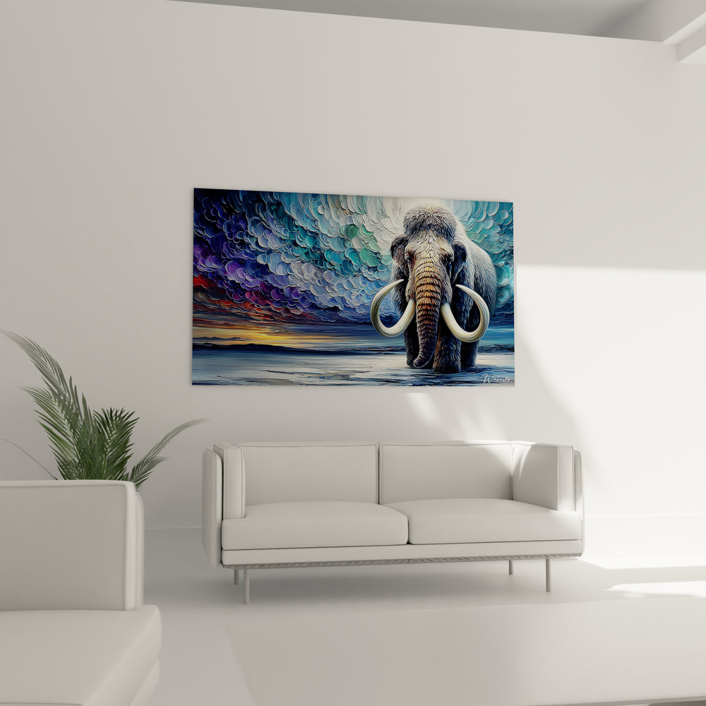 Tags : tableau mammouth laineux, art préhistorique, décoration murale, peinture animalière, ciel dramatique