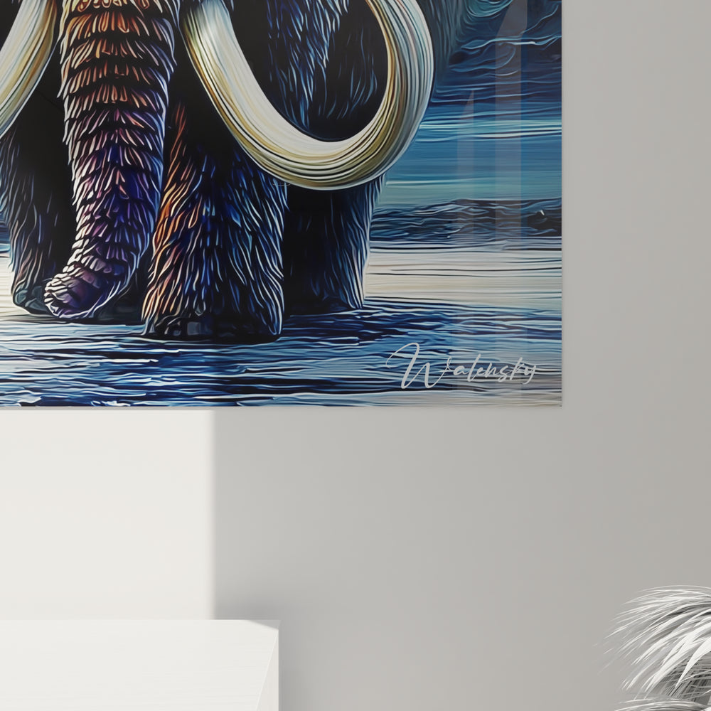 La palette chromatique de ce tableau art préhistorique s'articule autour de nuances froides dominantes, allant du bleu profond au turquoise éclatant, ponctuées de touches violettes et dorées qui réchauffent l'ensemble. Le ciel aux nuages stylisés évoque la puissance des forces naturelles et le passage du temps, symbolisant la majesté éphémère de ces créatures disparues. Les tons terreux du mammouth contrastent harmonieusement avec la fraîcheur des bleus environnants, créant un équilibre visuel parfait qui invite à la contemplation et à la rêverie sur ces époques révolues.