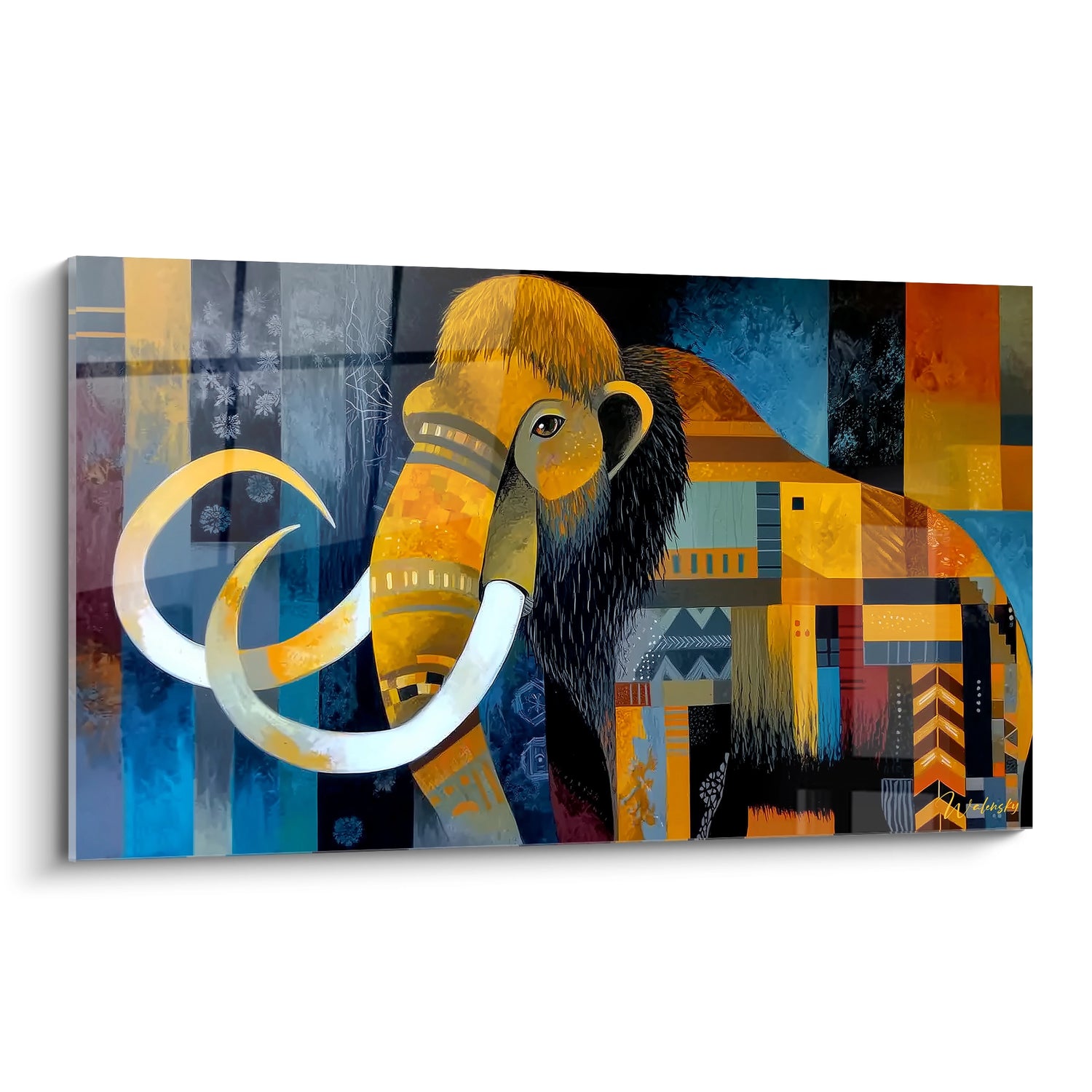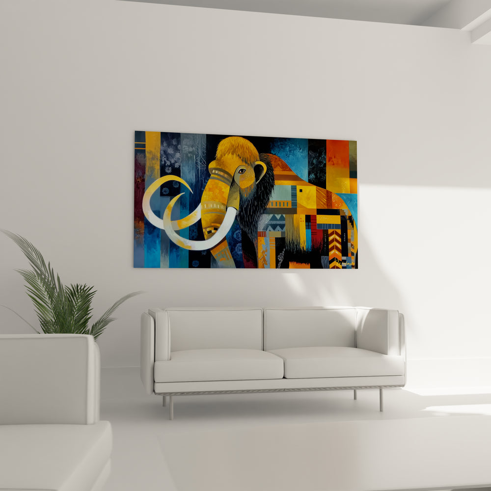 Tags : mammouth laineux, tableau géométrique, art préhistorique, décoration murale, œuvre colorée