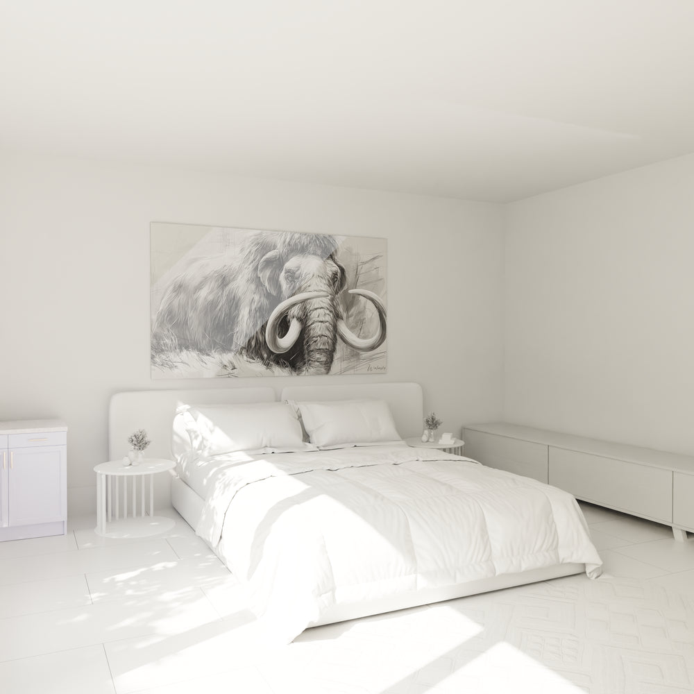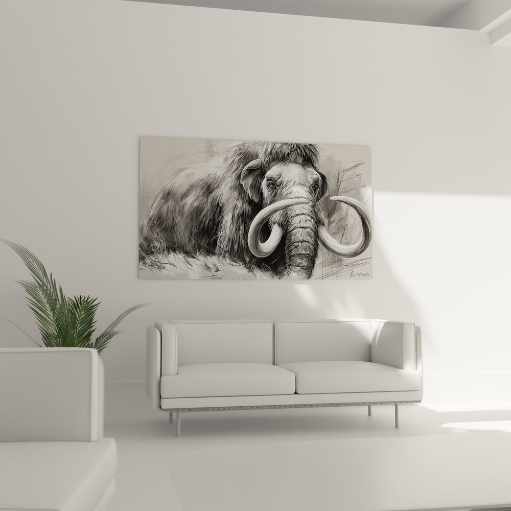 La palette monochrome de ce tableau mammouth noir et blanc renforce l'aspect intemporel et mystérieux de l'œuvre. Les nuances de gris créent une profondeur remarquable, évoquant la brume des temps préhistoriques. Le mammouth symbolise la force, la résilience et la mémoire ancestrale, représentant un lien tangible avec nos origines primitives et l'histoire de notre planète.