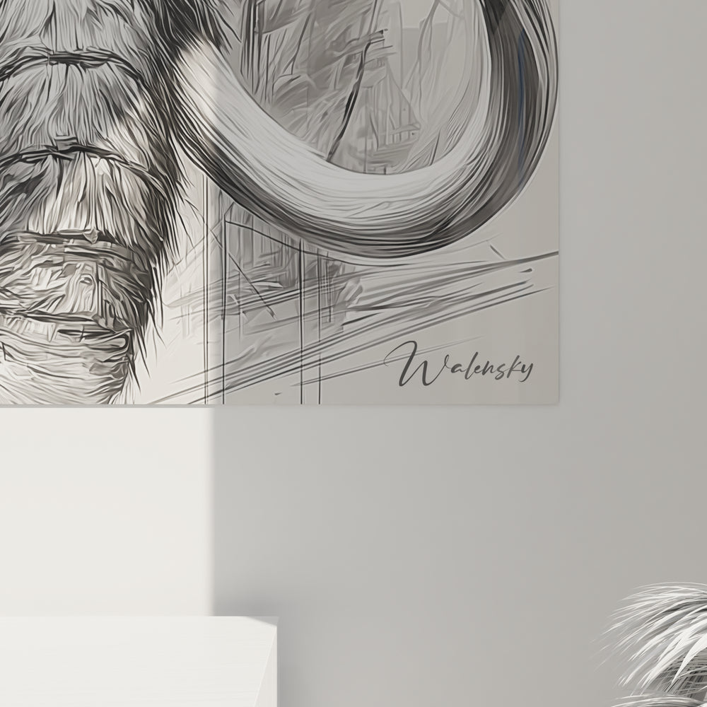 Ce tableau mural mammouth laineux présente une représentation saisissante d'un mammouth préhistorique dans un style artistique noir et blanc remarquable. L'œuvre capture la majesté du mammouth avec ses défenses courbes caractéristiques et sa fourrure épaisse délicatement travaillée. Le dessin mammouth réaliste met en valeur chaque détail anatomique de cet animal emblématique de l'ère glaciaire. Les traits fins et précis révèlent la texture de la fourrure laineuse, tandis que les défenses imposantes créent un point focal dramatique. Cette illustration mammouth artistique combine réalisme et expression artistique pour créer une œuvre d'une beauté saisissante. Le tableau préhistorique moderne s'inscrit dans une démarche artistique contemporaine qui revisite les créatures légendaires du passé. L'artiste a su capturer l'essence sauvage et primitive de cet animal disparu tout en apportant une dimension esthétique moderne. Cette décoration murale mammouth transformera instantanément votre espace en créant une ambiance à la fois mystérieuse et fascinante. L'œuvre invite à la contemplation et au voyage dans le temps, évoquant les vastes plaines glacées où ces créatures majestueuses évoluaient autrefois.