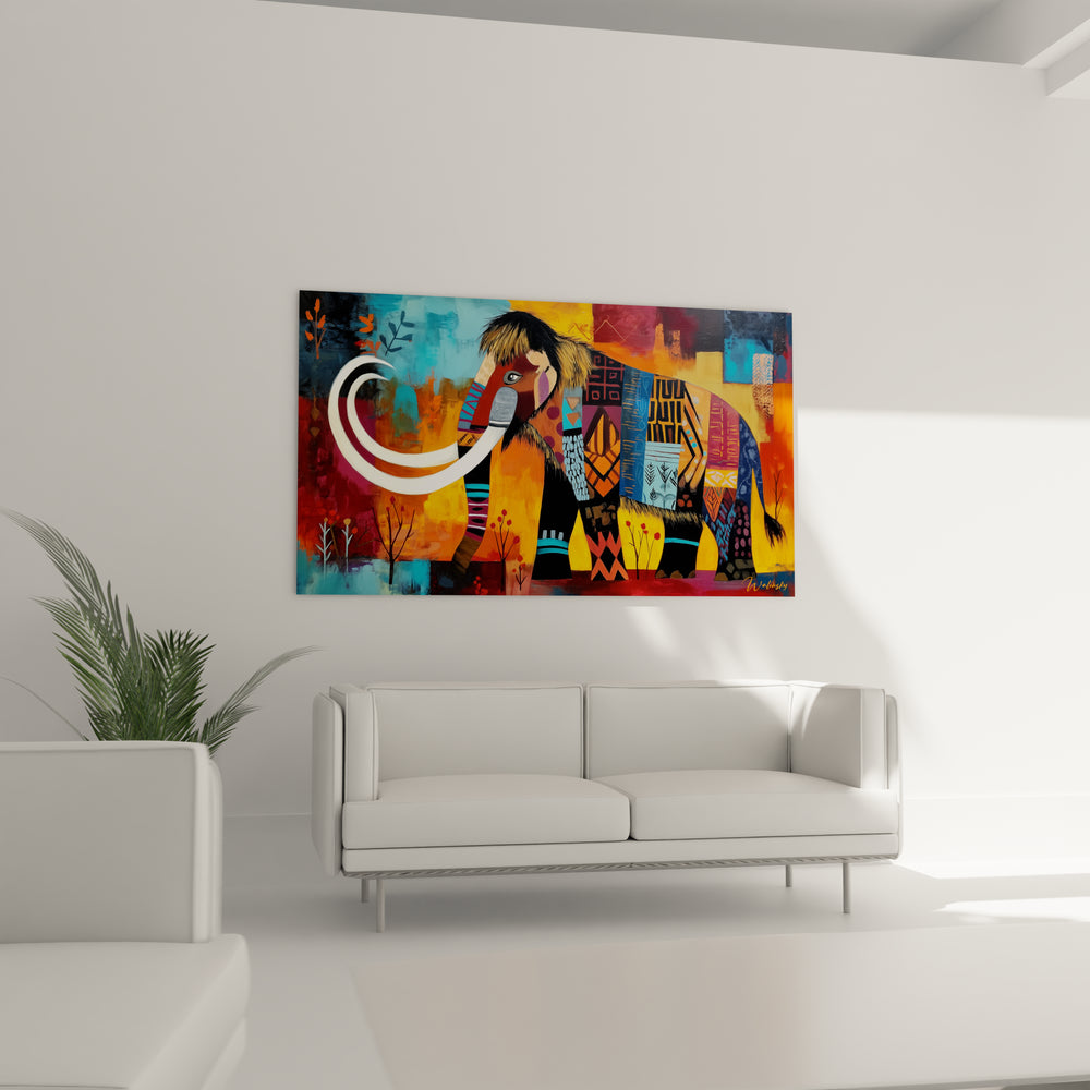 Tags : mammouth laineux, art géométrique, patchwork coloré, décoration murale, art animalier