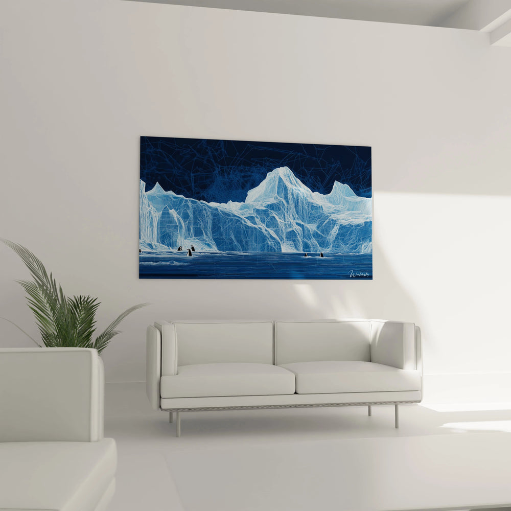 Cette œuvre représente un paysage arctique saisissant où des tableau manchot évoluent dans un environnement glacé d'une beauté exceptionnelle. Les manchots, silhouettes noires et blanches distinctives, se dressent fièrement sur la glace bleue au premier plan, créant un contraste visuel puissant avec les imposants icebergs qui dominent l'arrière-plan. Cette décoration murale manchot arctique capture l'essence même de la vie polaire avec une précision remarquable. L'atmosphère générale dégage une sérénité profonde, renforcée par la palette chromatique dominée par les tons bleus et blancs. L'œuvre révèle immédiatement sa force à travers cette composition équilibrée qui place les manchots comme gardiens de ce royaume de glace.