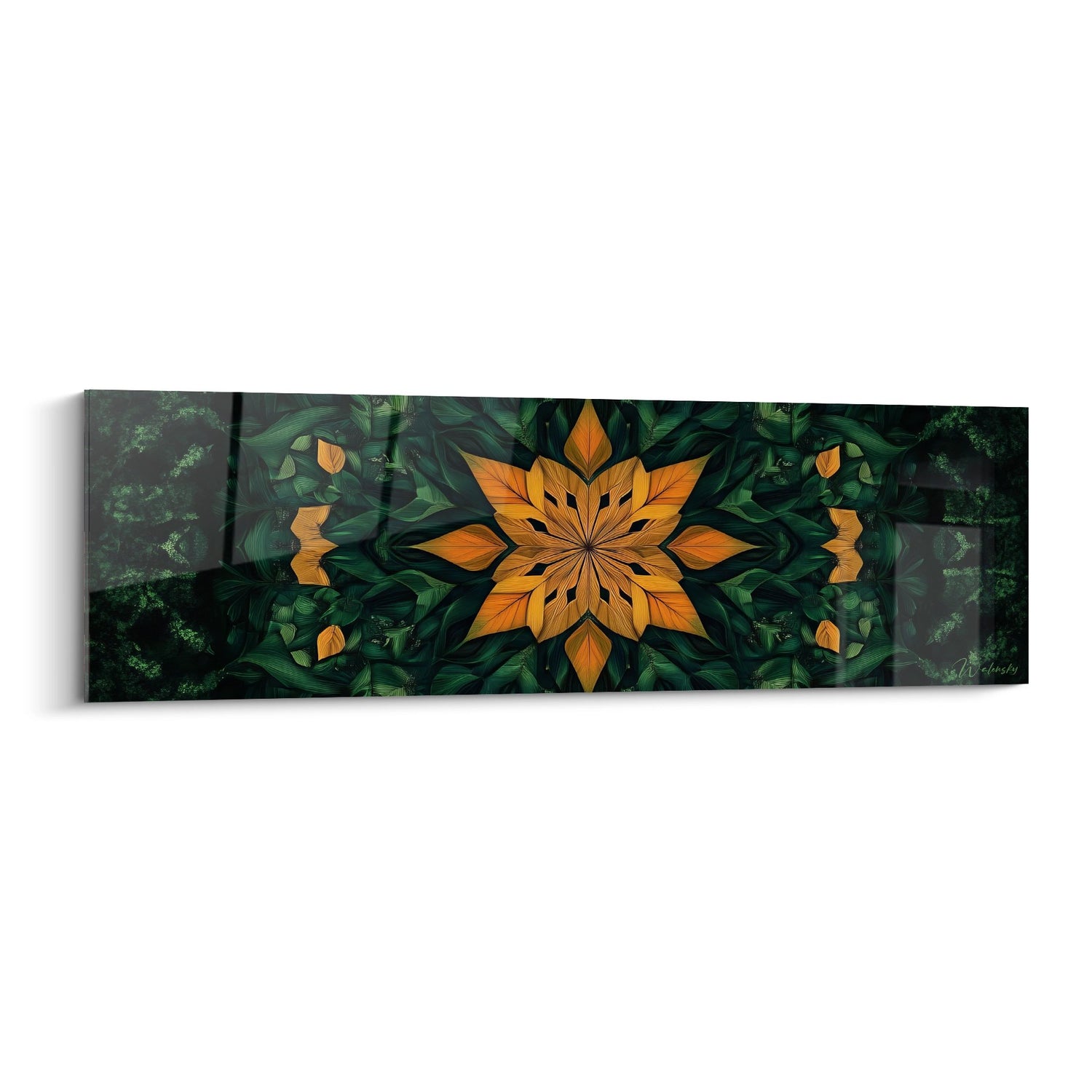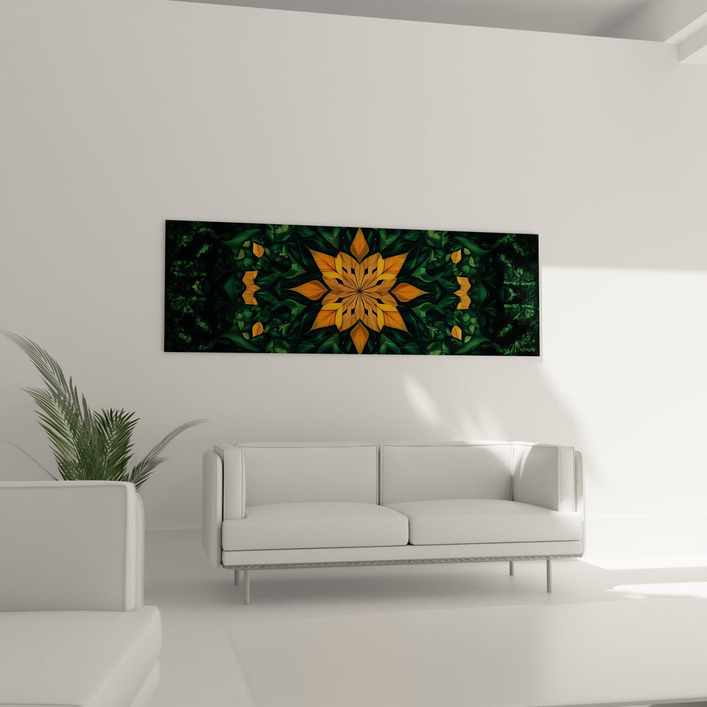 Ce tableau mural mandala présente une composition géométrique fascinante où s'épanouit un motif floral fractale aux teintes orangées éclatantes. Au centre de l'œuvre, une fleur géométrique stylisée déploie ses pétales en symétrie parfaite, créant un mandala végétal d'une beauté saisissante. Les nuances d'orange cuivré et d'ambre se marient harmonieusement avec les tons verts profonds de la végétation luxuriante qui encadre cette création florale. Cette œuvre d'art fractale révèle une complexité mathématique remarquable, où chaque élément semble réfléchir et amplifier les autres dans une danse infinie de formes organiques. Le tableau décoratif mandala transforme l'espace par sa dimension panoramique, invitant le regard à explorer les détails minutieux de cette composition géométrique nature. Les feuillages stylisés qui entourent le motif central créent un cadre naturel sophistiqué, rappelant les jardins secrets et les forêts enchantées. L'artiste a su capturer l'essence même de la croissance végétale dans un langage géométrique moderne, où la symétrie radiale fractale évoque les cycles de la nature et l'harmonie universelle.