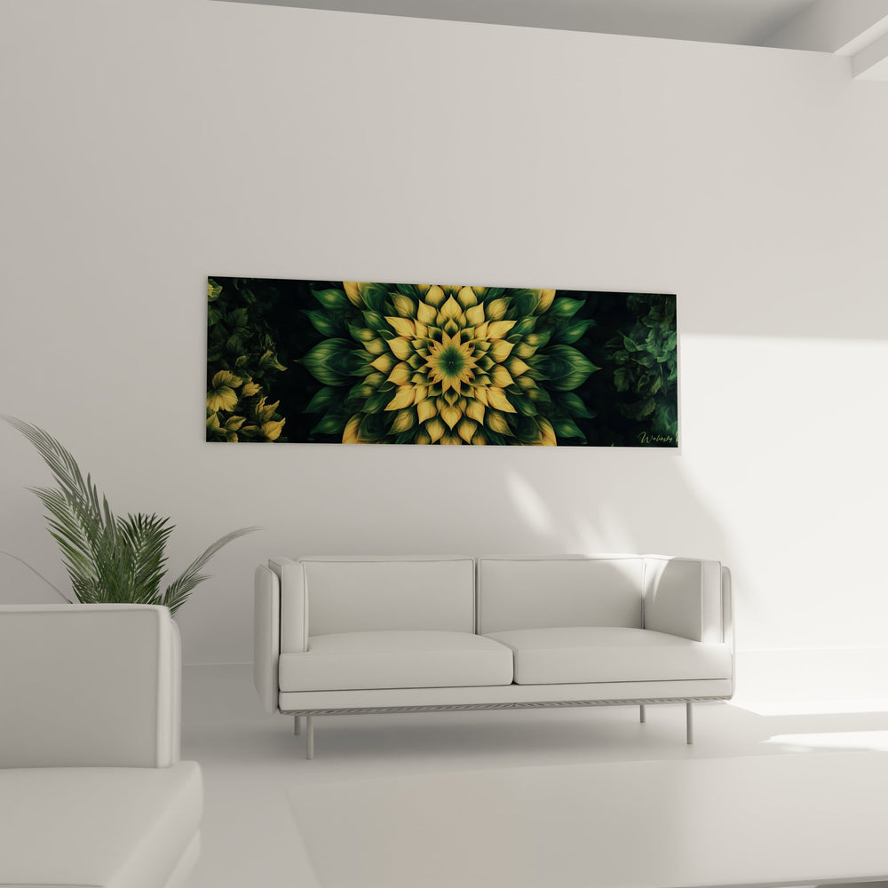Les teintes dorées et vertes de ce tableau fractale végétal évoquent l'harmonie entre la terre et la lumière divine. Le doré symbolise l'illumination spirituelle et la sagesse, tandis que le vert profond rappelle la croissance et la régénération naturelle. Cette palette fractale naturelle crée un équilibre parfait entre chaleur et fraîcheur, invitant à la sérénité et à la méditation contemplative dans votre intérieur.
