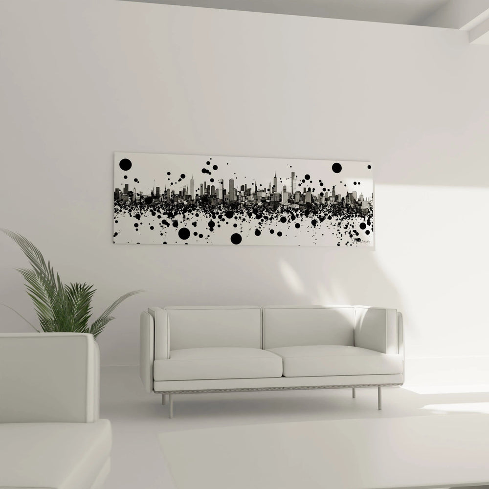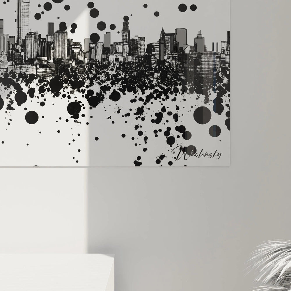 Ce tableau skyline urbain captive immédiatement par son contraste saisissant entre architecture urbaine et explosion artistique. La silhouette parfaitement définie d'une métropole moderne se déploie sur toute la largeur de l'œuvre, créant un horizon reconnaissable et évocateur. Les gratte-ciels s'élèvent avec précision, formant une ligne directrice claire qui guide le regard. Cette décoration murale urbaine contemporaine transforme un paysage citadin classique en une expérience visuelle dynamique. L'effet tableau skyline noir et blanc éclaboussé génère une tension visuelle captivante, où l'ordre architectural rencontre le chaos créatif des projections d'encre.