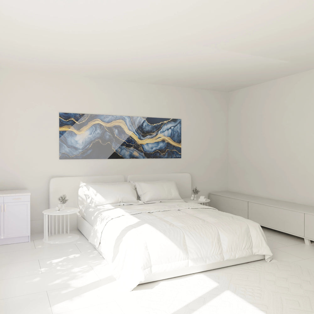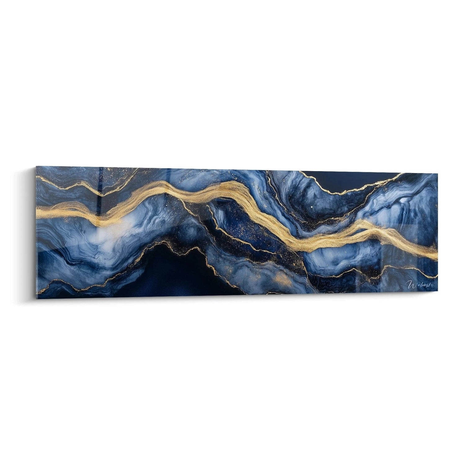Ce tableau marbre liquide révèle une composition abstraite saisissante où les nuances de bleu profond se mêlent harmonieusement aux veines dorées organiques. L'œuvre évoque immédiatement la fluidité d'un marbre précieux en mouvement, créant un tableau marbre liquide bleu doré d'une rare intensité visuelle. Les formations ondulantes rappellent les méandres d'une rivière souterraine, tandis que les accents dorés apportent une dimension luxueuse à l'ensemble. Cette décoration murale marbre liquide capture l'essence même de la géologie artistique contemporaine, transformant l'espace par sa présence magnétique et ses contrastes saisissants.