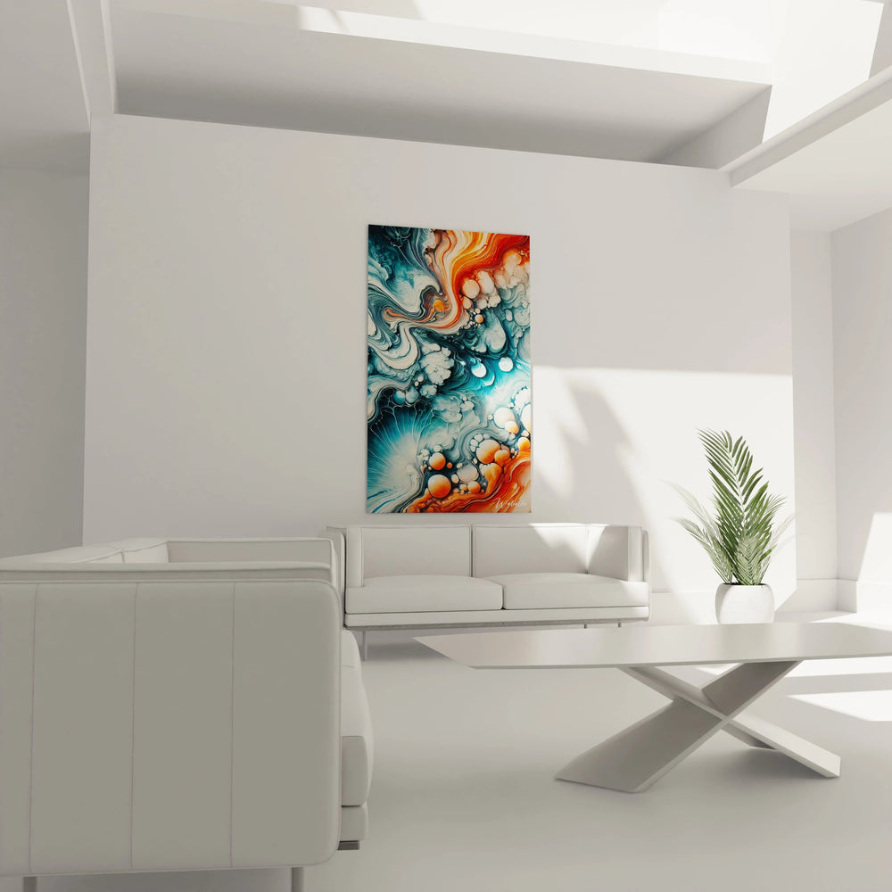 Imaginé comme un instant suspendu, ce tableau exprime l’émotion brute de deux éléments antagonistes qui entrent en symbiose. La résine epoxy apporte une brillance spectaculaire et une profondeur inégalée, donnant vie à des textures changeantes selon la lumière et l’angle de vue. Les nuances de bleu intense croisent des éclats d’orange flamboyant et des touches de blanc pur, créant un équilibre vivant entre chaleur et fraîcheur.