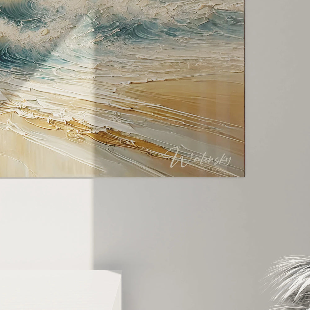 Laissez le Tableau Marée d'Or devenir l’âme de votre décoration intérieure, un rappel constant de la beauté paradoxale entre la force et la douceur, la mélancolie et l’espérance. Chaque regard posé sur cette œuvre est une pause contemplative, un voyage sensoriel au cœur d’un paysage marin intemporel.