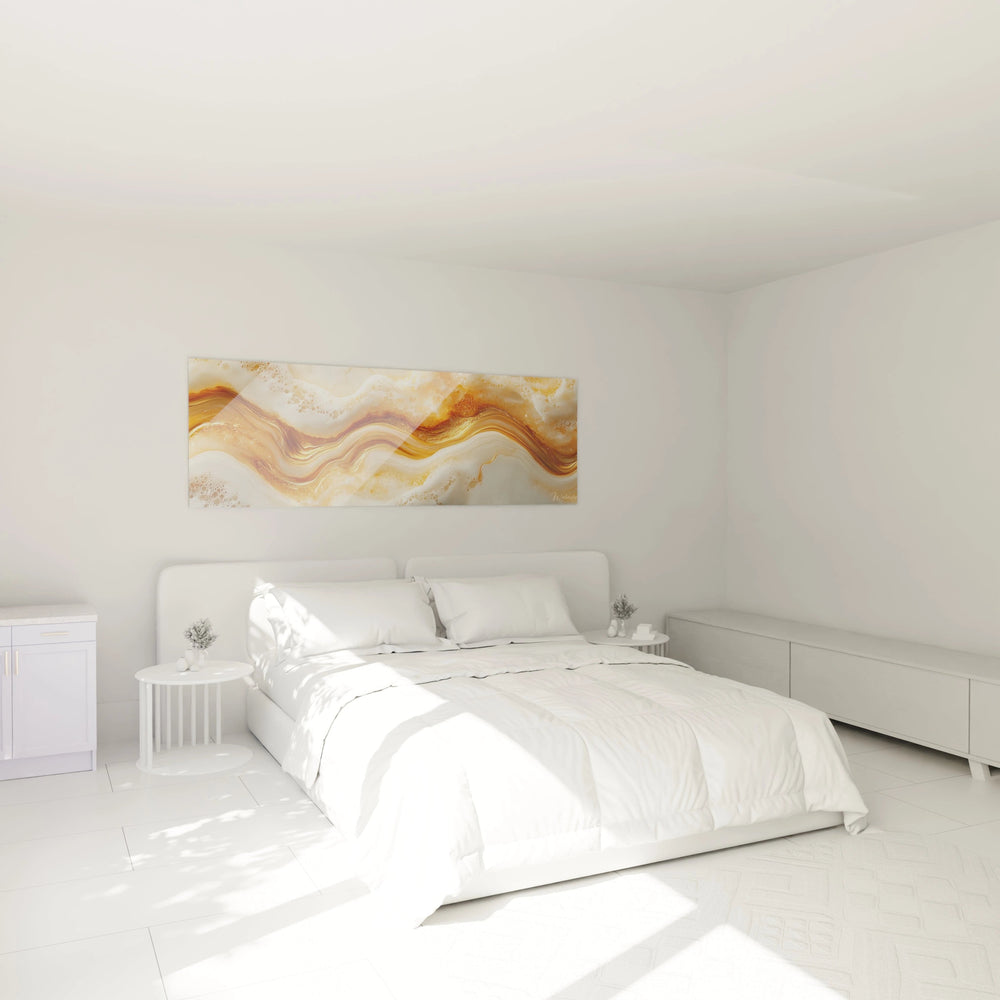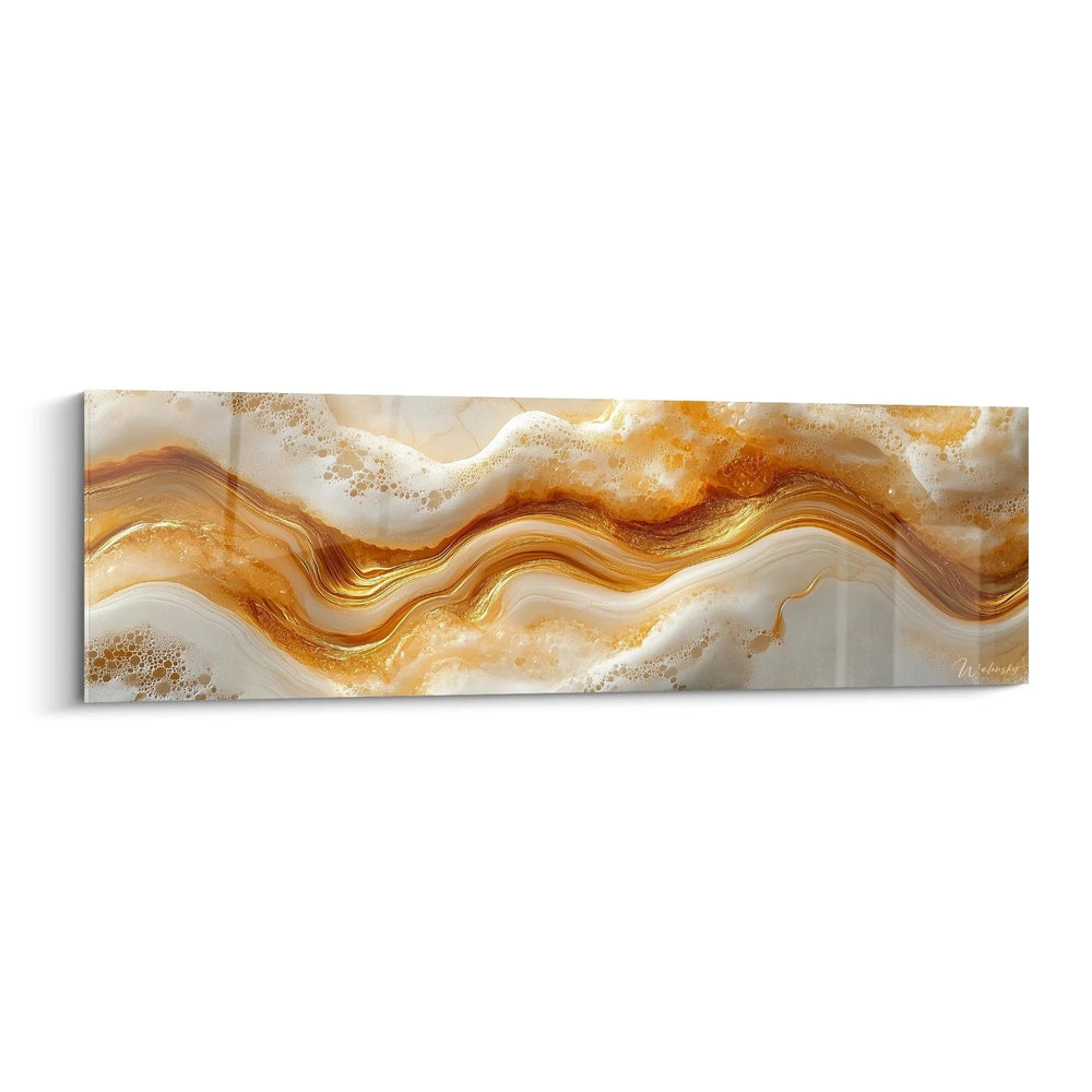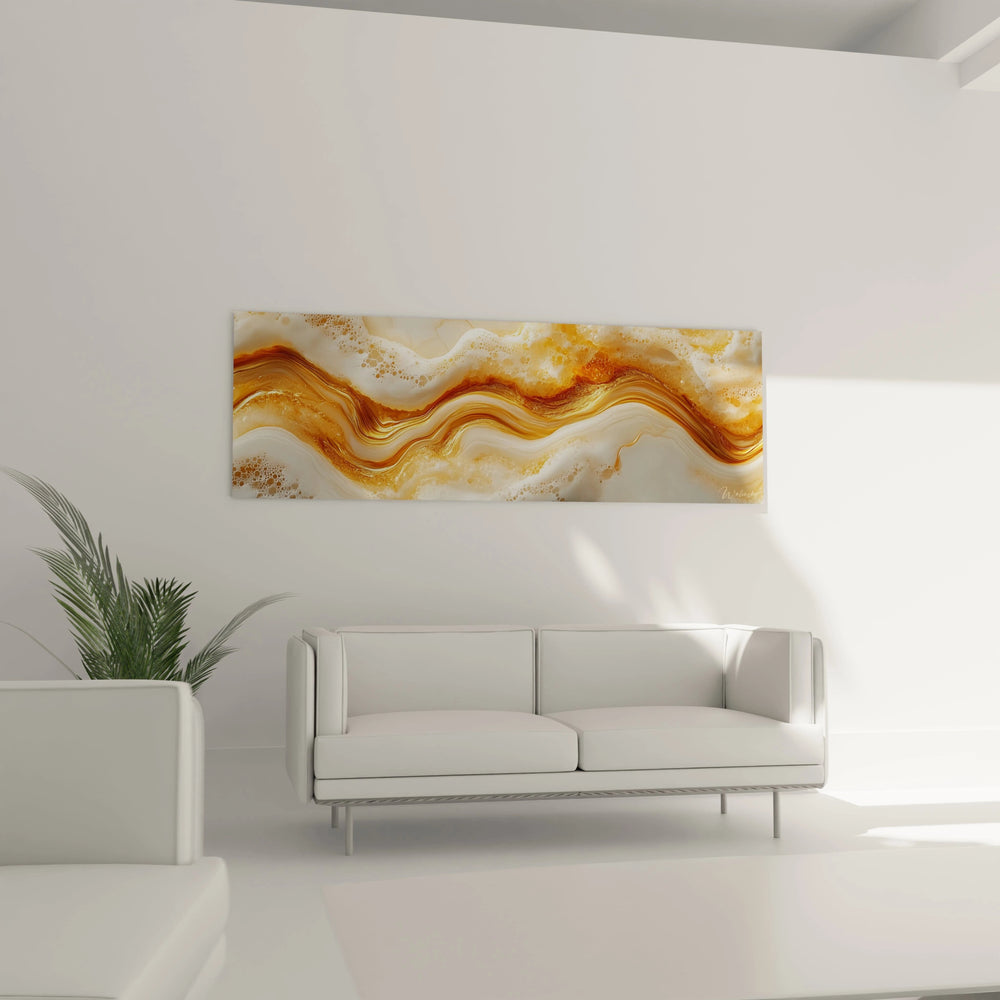 La composition de ce tableau abstrait doré moderne panoramique suit un mouvement horizontal qui guide naturellement le regard de gauche à droite. Les ondulations principales créent des lignes directrices organiques qui traversent toute la largeur de l'œuvre, établissant un équilibre dynamique parfait. La perspective adopte un point de vue rapproché sur ces formations fluides, comme si l'observateur contemplait des vagues dorées figées dans le temps. Cette art mural abstrait fluide utilise intelligemment l'espace panoramique pour amplifier l'effet de mouvement continu, créant une sensation d'infini qui dépasse les limites physiques du cadre.