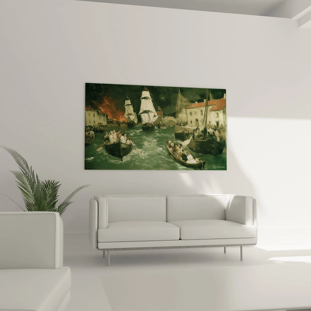 Ce tableau maritime captive immédiatement par sa représentation dramatique d'une scène portuaire en détresse. L'œuvre dépeint avec un réalisme saisissant un port en proie aux flammes, tandis que des navires à voiles tentent une évasion périlleuse. Les tableau navires tempête dominent la composition, leurs voiles blanches contrastant puissamment avec l'obscurité environnante. La technique picturale révèle une maîtrise remarquable des effets atmosphériques, créant une tension visuelle palpable. Ce tableau port dramatique transporte instantanément l'observateur au cœur d'une catastrophe maritime historique, où chaque détail contribue à l'intensité narrative de la scène.