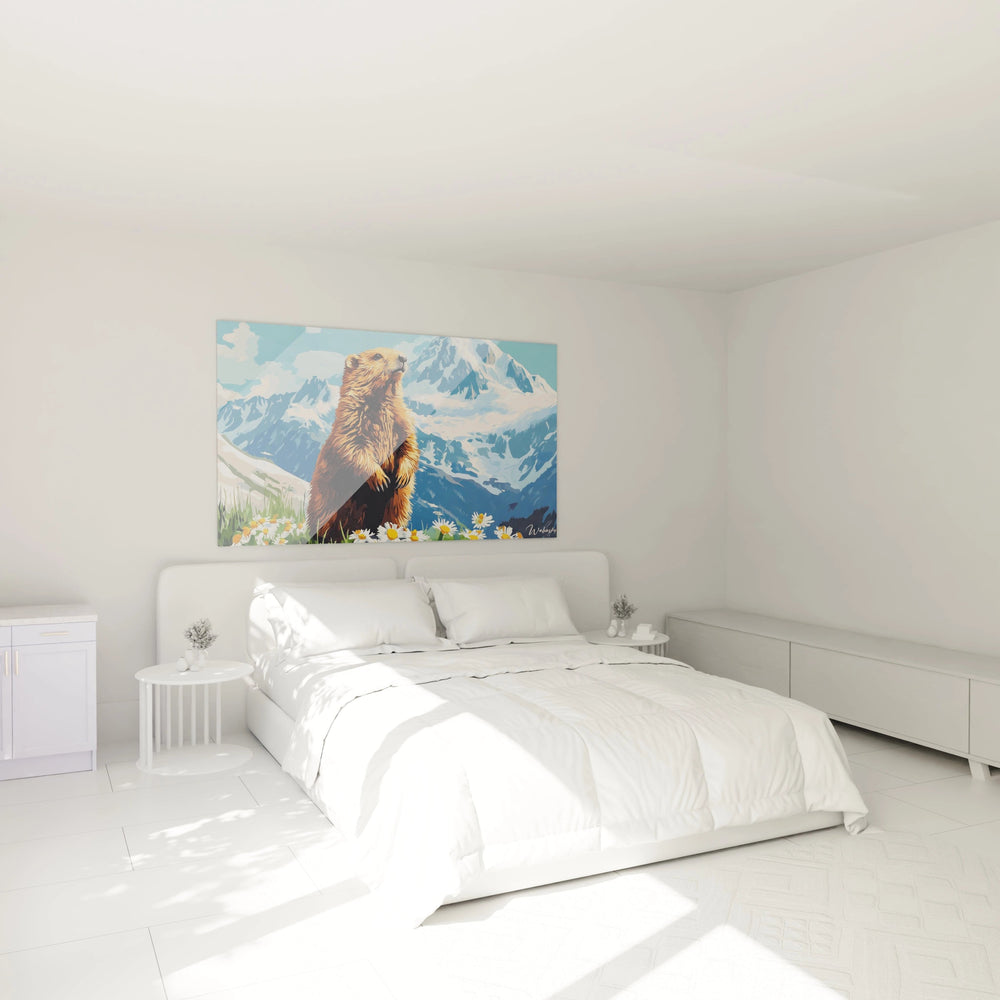 Ce tableau marmotte décoratif trouvera parfaitement sa place dans un intérieur aux tonalités naturelles. Un mur de couleur neutre - blanc cassé, beige ou gris clair - permettra aux couleurs vives de l'œuvre de s'exprimer pleinement. L'art mural marmotte s'intégrera idéalement dans un salon, une salle à manger ou un bureau où il apportera une touche de nature sauvage.