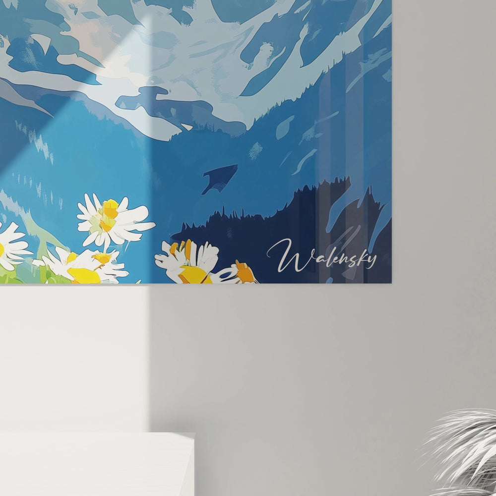 En s'approchant, le regard découvre progressivement une multitude de détails fascinants : les subtiles variations de couleur dans le pelage de l'animal, la texture particulière des montagnes enneigées, ou encore la délicatesse des pétales des marguerites. Cette richesse de détails dans ce tableau marmotte panoramique alpin offre une expérience d'observation renouvelée à chaque contemplation, révélant progressivement toutes les nuances de cette représentation saisissante.