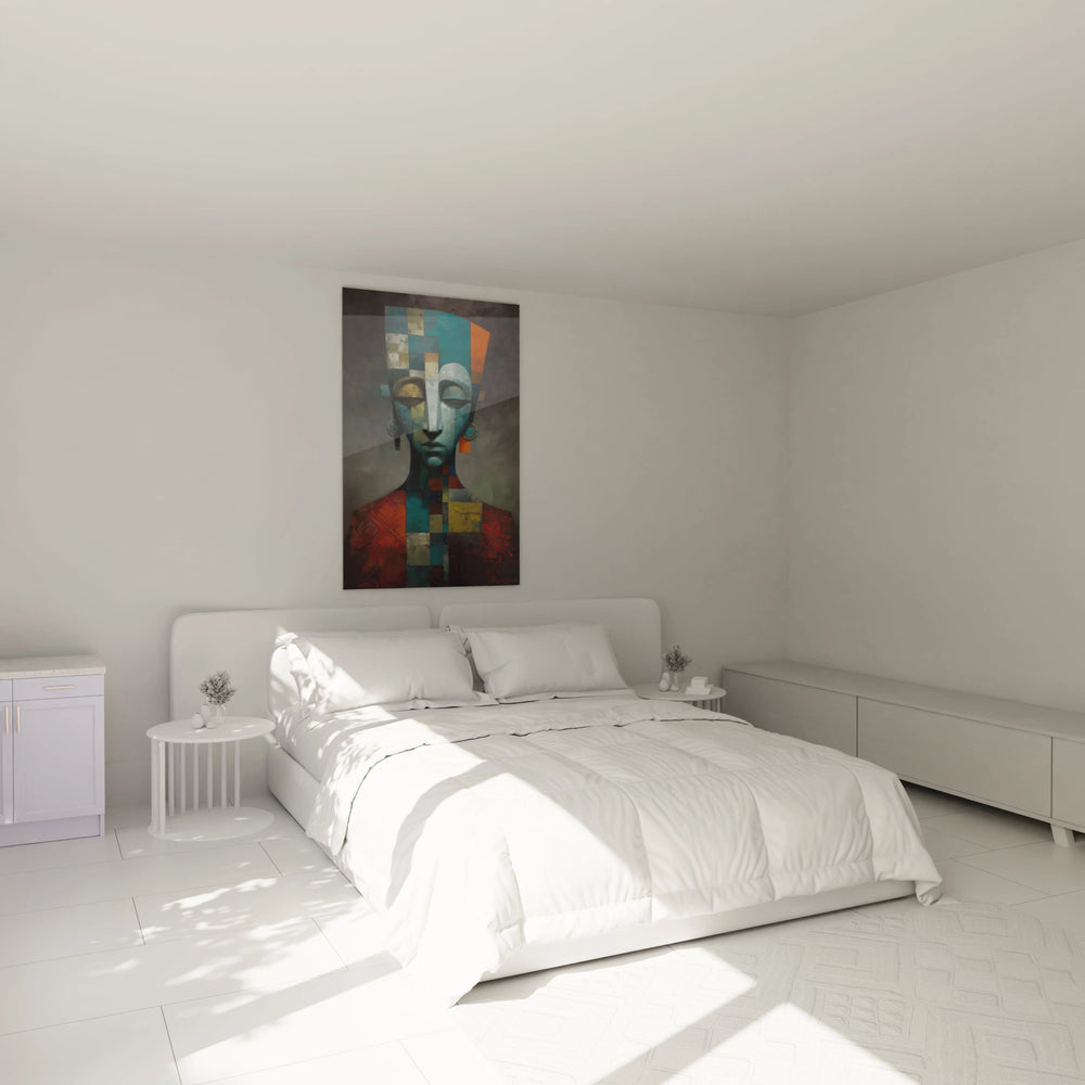 L'originalité de cette œuvre réside dans sa capacité à réinterpréter les codes esthétiques traditionnels à travers un prisme résolument moderne. Le traitement géométrique du visage, organisé en plans colorés distincts, crée une lecture multiple de l'image. Chaque moitié du masque raconte sa propre histoire chromatique, tandis que l'ensemble maintient une unité parfaite. Les boucles d'oreilles circulaires, finement détaillées, ajoutent une dimension ornementale qui ancre l'œuvre dans une référence culturelle sans tomber dans la citation littérale. Cet art mural masque ethnique se distingue par son équilibre entre abstraction géométrique et figuration reconnaissable. La stylisation du cou en bandes colorées prolonge l'esthétique fragmentée du visage, créant une continuité visuelle remarquable.