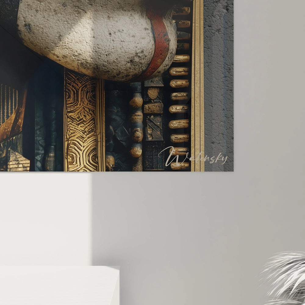 L'observation rapprochée révèle une multitude de détails invisibles à distance : gravures microscopiques sur les bijoux tribaux, variations subtiles dans les tons de chair, reflets changeants sur les surfaces des perles sacrées. À distance, l'effet d'ensemble crée une présence imposante, presque mystique. Les jeux d'ombre et de lumière donnent une impression de relief sculptural tribal. Cette décoration murale masque relief spirituel change d'aspect selon l'angle de vue, révélant tantôt la noblesse du profil, tantôt la richesse des ornements cérémoniels. L'expérience visuelle évolue constamment, maintenant l'attention dans une contemplation méditative.