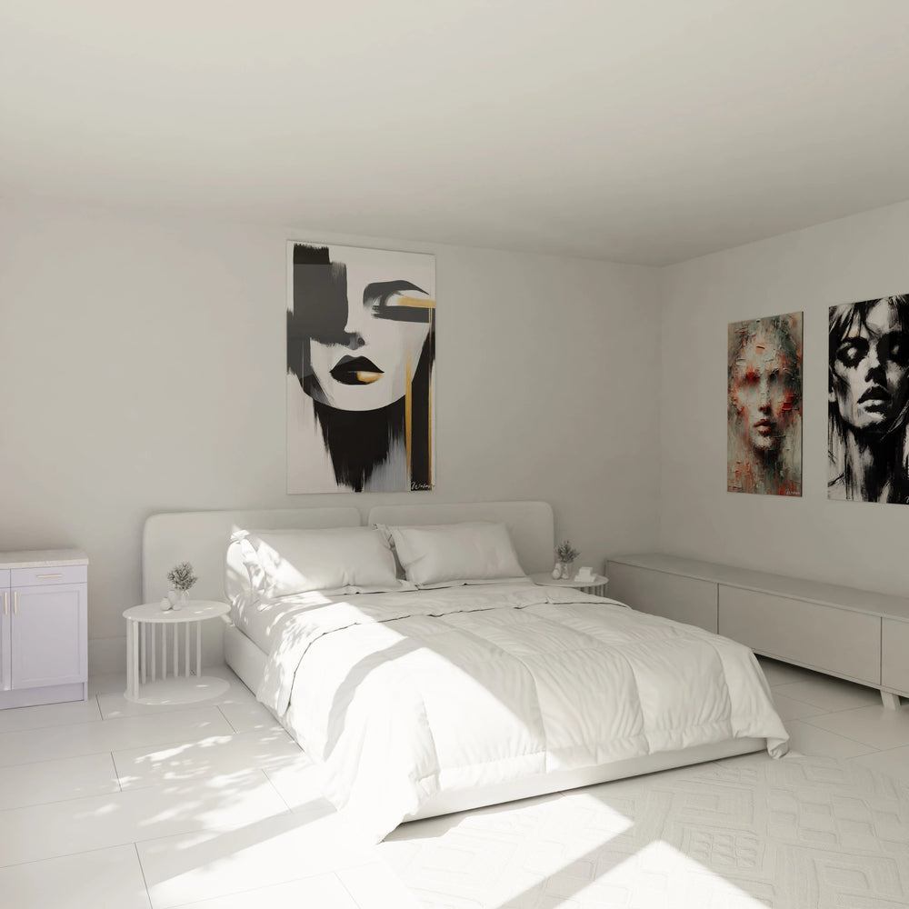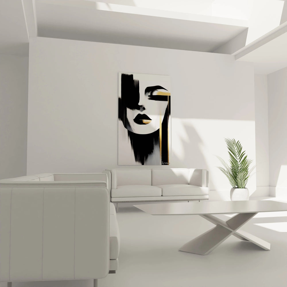 Chaque regard posé sur ce tableau dévoile une nouvelle nuance d’émotion. La silhouette partielle d’un visage, esquissée dans des contrastes intenses de noir et blanc, invite votre imagination à compléter ce qui est caché, à explorer les secrets qu’on dissimule derrière des masques invisibles. Au centre, une touche dorée sur les lèvres agit comme un éclat de vérité rare, un éclat précieux que vous découvrez à chaque instant, raffinant votre expérience contemplative.