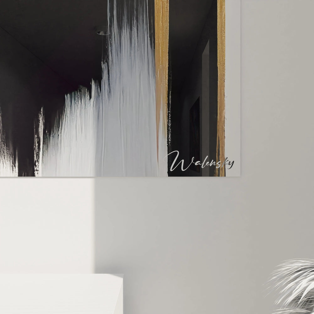 Cette création mise sur la force du contraste, mêlant sobriété et éclat, pour une décoration à la fois moderne et intemporelle. La simplicité apparente masque une énergie vibrante, capturée dans chaque coup de pinceau qui donne vie au texte abstrait. Le résultat ? Un tableau qui respire la noblesse tout en restant accessible à votre univers quotidien.