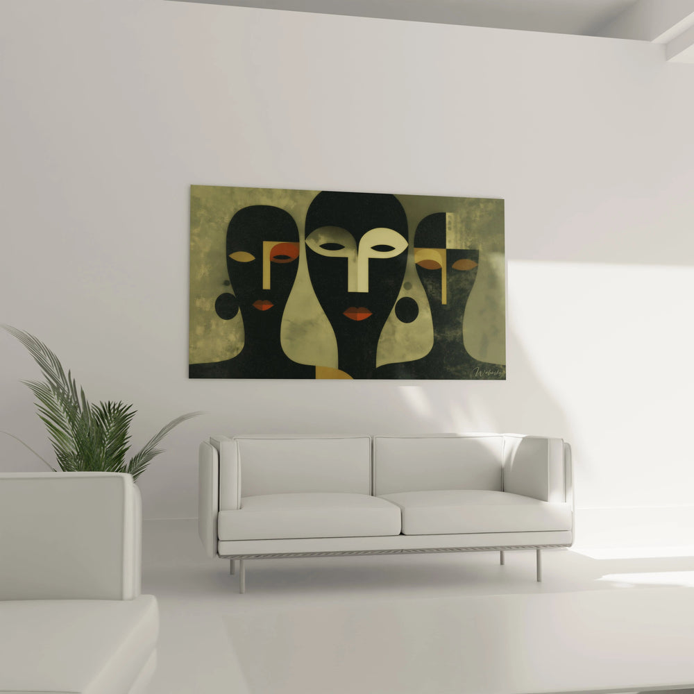 L'œuvre se distingue par sa représentation stylisée de cinq masques aux expressions contemplatives. Chaque visage présente des traits géométriques simplifiés, créant une unité visuelle cohérente. Les yeux en amande, caractéristique centrale de ce tableau masques yeux amande, confèrent une intensité mystérieuse à l'ensemble. Les formes ovales des visages s'organisent selon un rythme visuel équilibré. Cette art mural masques stylises révèle une maîtrise technique remarquable dans la simplification des formes humaines tout en conservant leur expressivité essentielle.