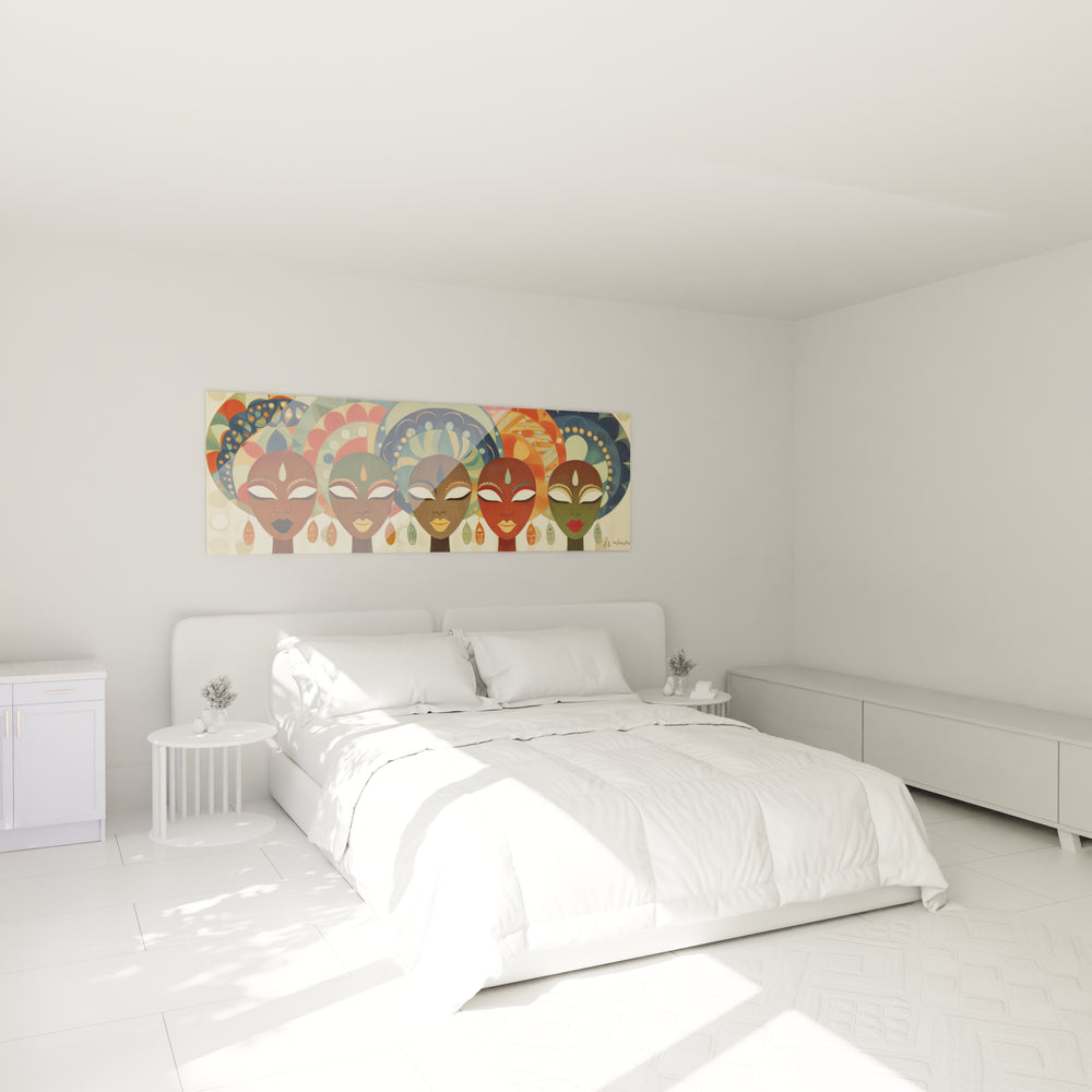Cette décoration murale masques tribal se distingue par plusieurs éléments visuels remarquables qui en font une œuvre inédite. La stylisation des traits faciaux adopte un langage plastique moderne tout en conservant l'essence symbolique des masques traditionnels. Chaque personnage possède une coiffure unique - du turban orné de perles aux formes spiralées complexes - qui témoigne d'une recherche iconographique approfondie. Les bijoux d'oreilles, différents pour chaque masque, intègrent des motifs géométriques spécifiques qui font écho aux traditions ornementales africaines. La signature discrète en bas à droite confirme l'aspect artistique de cette création originale. Cette synthèse entre modernité graphique et héritage culturel crée une esthétique unique impossible à reproduire.
