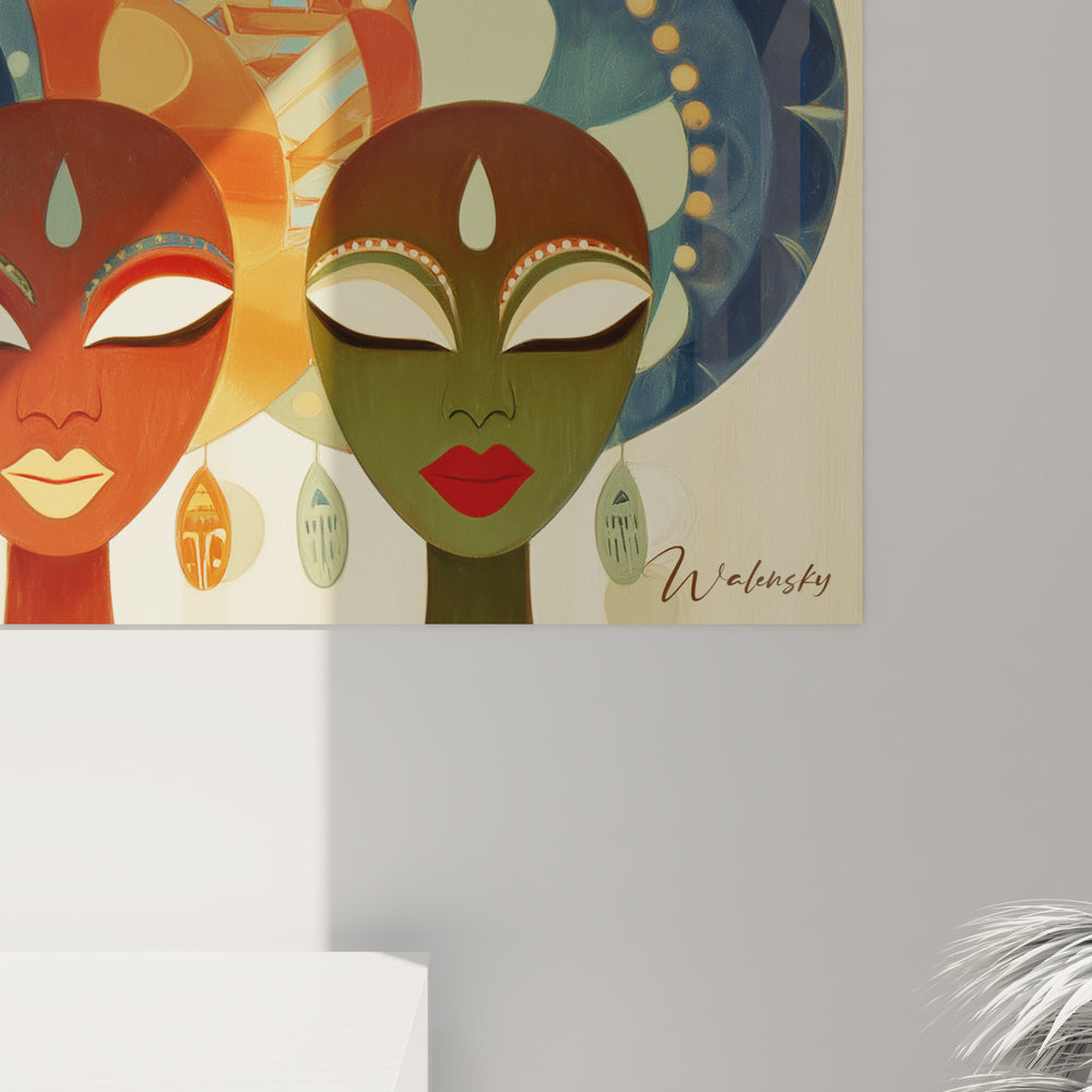 L'analyse des textures révèle un traitement lisse et mat qui évoque la technique de l'acrylique ou de la gouache. Les surfaces des masques présentent une finition uniforme sans effet de matière apparent, privilégiant la pureté des formes et des couleurs. Les détails décoratifs - points blancs sur les coiffures, motifs géométriques sur les bijoux d'oreilles - sont appliqués avec une précision millimétrique. Cette art mural masques contemporains joue sur les contrastes entre zones lisses et zones texturées par la couleur pure. Les effets de lumière sont suggérés par les dégradés subtils sur les volumes des visages, créant une impression de relief sans ombrage marqué. La technique privilégie la synthèse formelle plutôt que le réalisme descriptif.