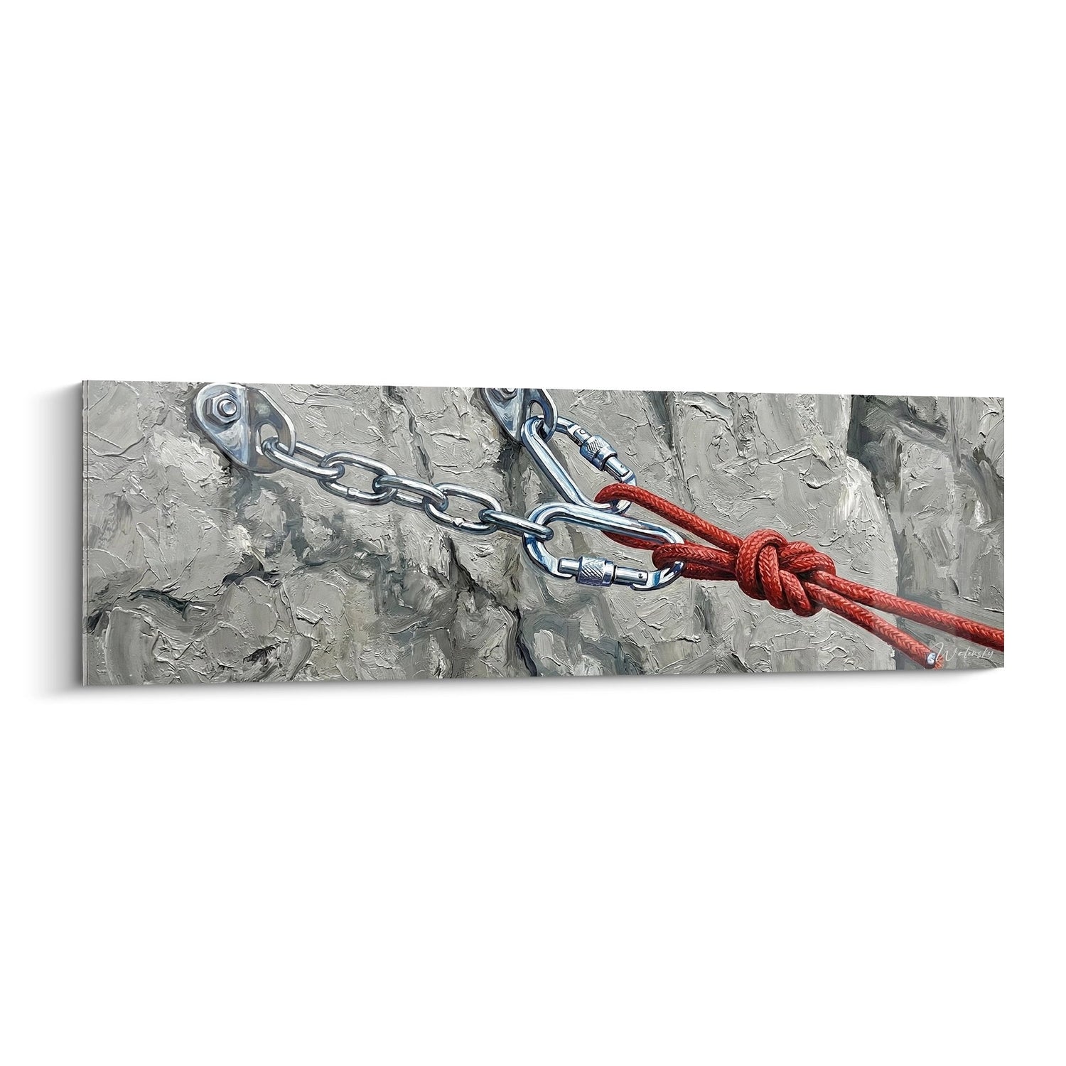 Cette œuvre d'art murale captivante met en scène les éléments essentiels de l'équipement d'escalade dans un rendu artistique saisissant. Le tableau présente une chaîne métallique robuste fixée à la paroi rocheuse par des ancrages solides, reliée à une corde d'escalade rouge vif nouée avec précision. La texture rugueuse de la roche calcaire, peinte dans des tons gris nuancés, contraste magnifiquement avec l'éclat métallique des maillons et la vivacité du rouge de la corde. Cette représentation fidèle du matériel de sécurité en escalade évoque l'univers de l'alpinisme, de la via ferrata et de l'escalade sportive. Les détails minutieux des mousquetons, des maillons de chaîne et du tissage de la corde témoignent d'une approche réaliste qui séduira les grimpeurs expérimentés comme les amateurs d'art contemporain. L'ensemble dégage une atmosphère de confiance et de sécurité, valeurs fondamentales dans la pratique de l'escalade.