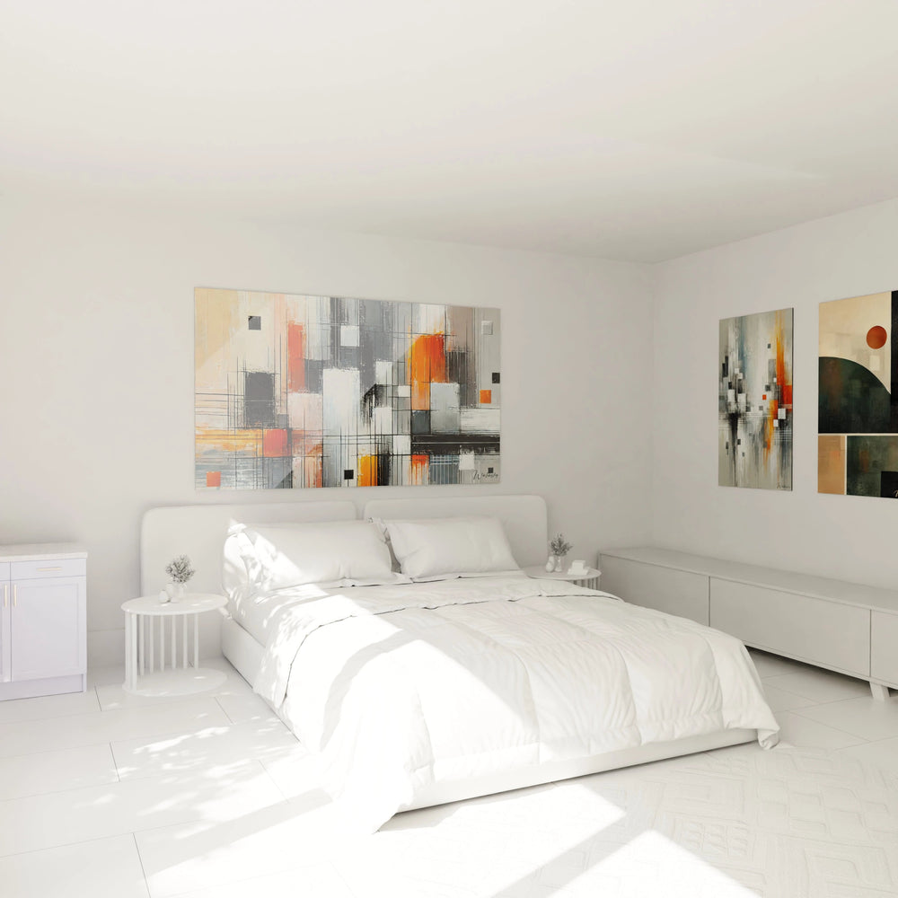 À travers un jeu maîtrisé de carrés et de rectangles, ce tableau crée un véritable dialogue entre chaleur et froideur. Les lignes nettes et angles précis évoquent la solidité du béton et l’acier des structures industrielles alors que les touches d’orange vif insufflent à l’ensemble une intensité presque palpable, comme un battement de cœur au sein de la ville. Ressentez la profondeur des superpositions et la texture subtile qui invite à effleurer l’œuvre pour en capter toutes les nuances.