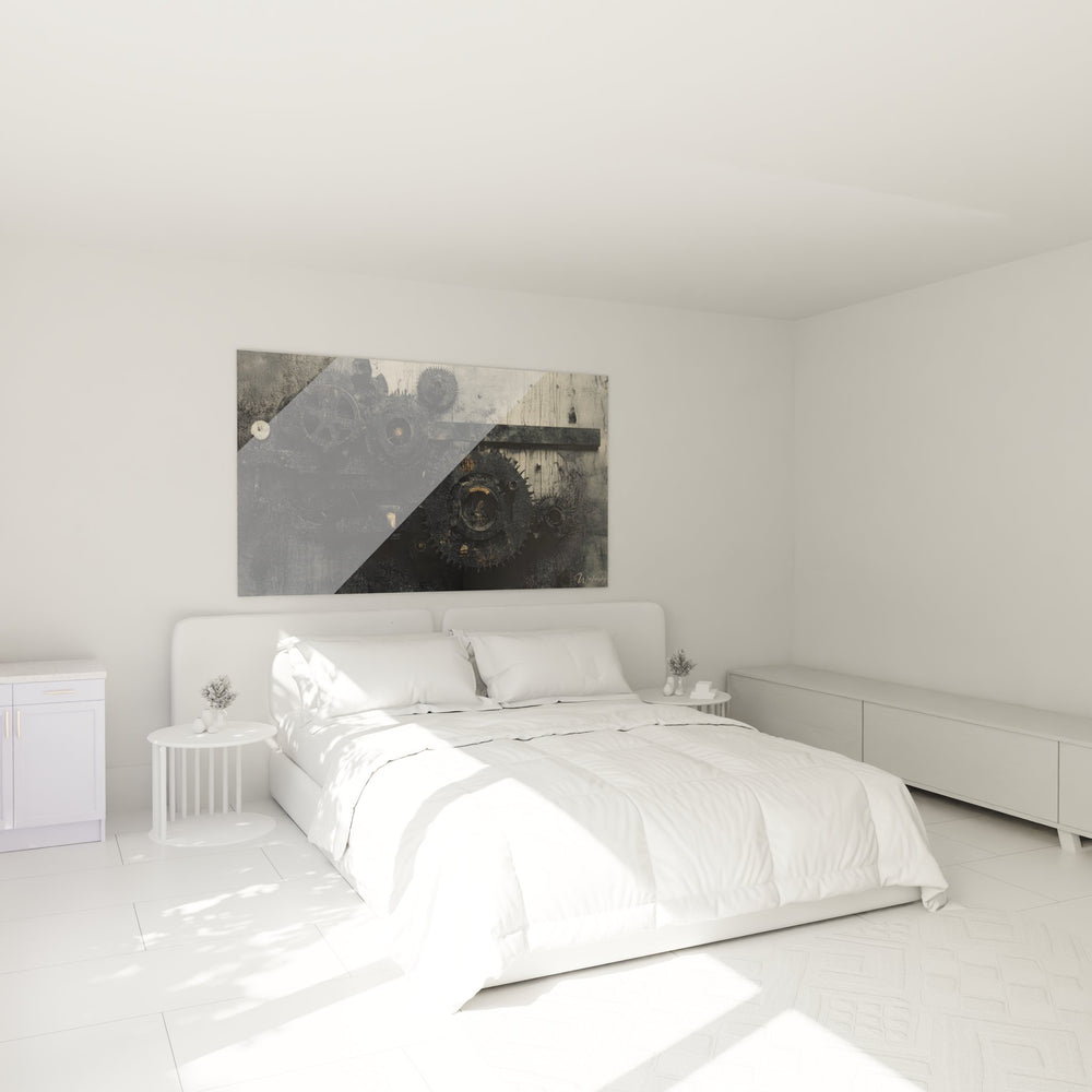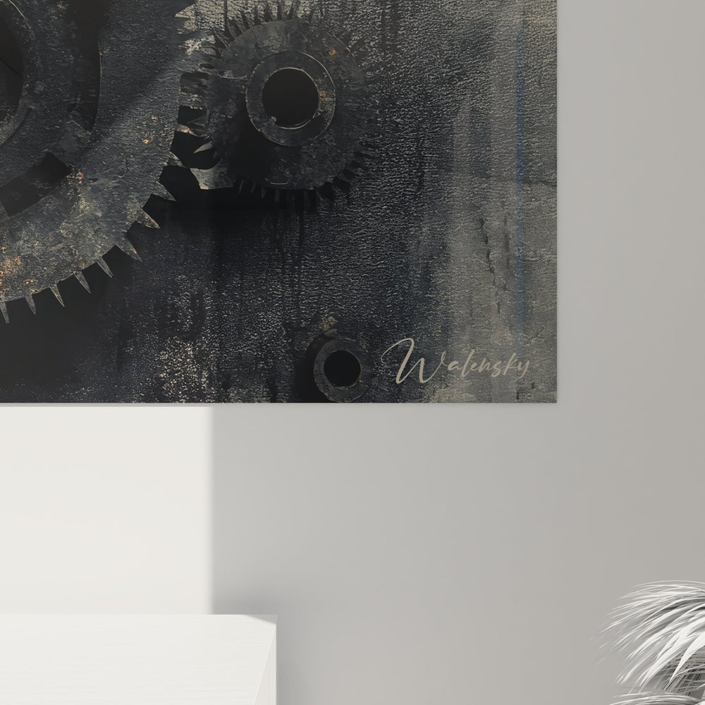 Ce tableau mural mécanismes industriels présente une composition artistique fascinante mettant en scène des engrenages métalliques et des rouages complexes dans un style industriel contemporain. L'œuvre révèle un assemblage sophistiqué de machines vintage aux textures métalliques patinées, créant une atmosphère steampunk authentique. Les rouages et engrenages se déploient harmonieusement sur la toile, révélant des détails minutieux de la mécanique industrielle. Cette décoration murale industrielle capture l'essence de l'ingénierie mécanique à travers des tons métalliques nuancés allant du gris anthracite au bronze oxydé. Les mécanismes d'horlogerie géants semblent figés dans le temps, offrant une perspective unique sur l'artisanat mécanique d'autrefois. L'artiste a magistralement représenté la complexité des systèmes mécaniques anciens, où chaque denture d'engrenage raconte l'histoire de l'industrie manufacturière. Cette œuvre d'art industriel moderne transforme des éléments purement fonctionnels en véritables objets esthétiques, créant un dialogue visuel entre passé industriel et art contemporain.