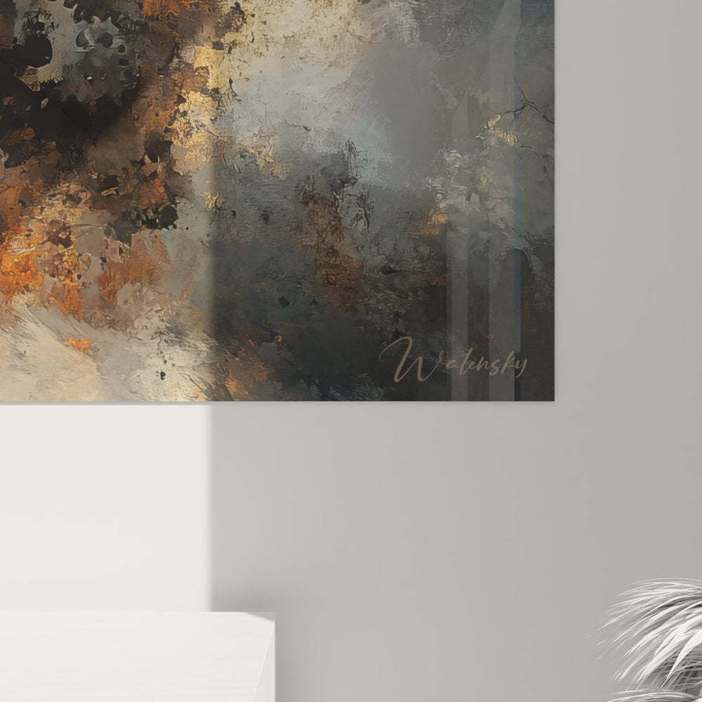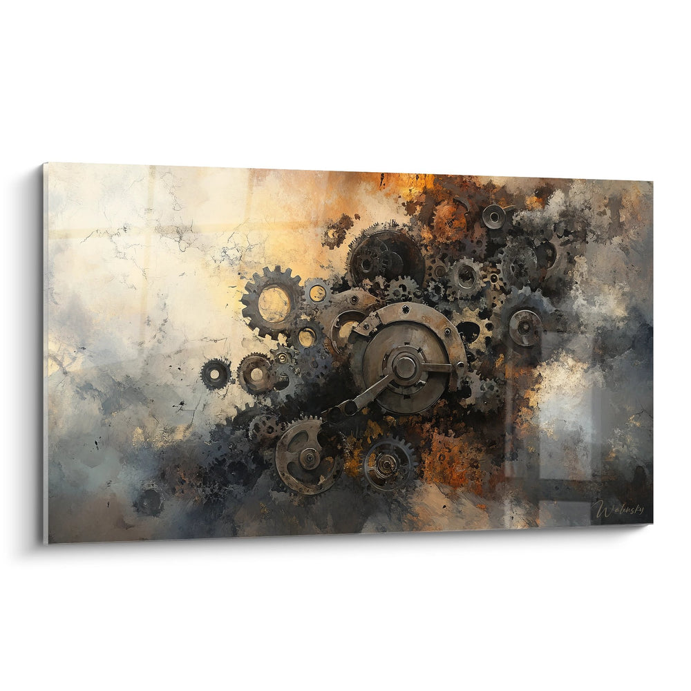 Ce tableau mural mécanismes rouillés présente une composition fascinante d'engrenages anciens et de rouages patinés par le temps. L'artiste a magistralement orchestré un ensemble de pièces mécaniques industrielles qui semblent émerger d'un fond texturé aux nuances terreuses. Les roues dentées métalliques de différentes tailles s'entremêlent dans une danse mécanique figée, créant une profondeur visuelle remarquable. Cette œuvre d'art industriel vintage capture l'essence de l'âge d'or de la mécanique, où chaque composant d'horlogerie géant raconte une histoire d'ingénierie et de savoir-faire. Les détails minutieux de chaque engrenage, des plus petites pièces d'assemblage rouillées aux imposants mécanismes centraux, témoignent d'une recherche esthétique poussée. Cette décoration murale style steampunk transforme l'espace en véritable musée industriel contemporain, parfait pour les amateurs d'art mécanique abstrait moderne.