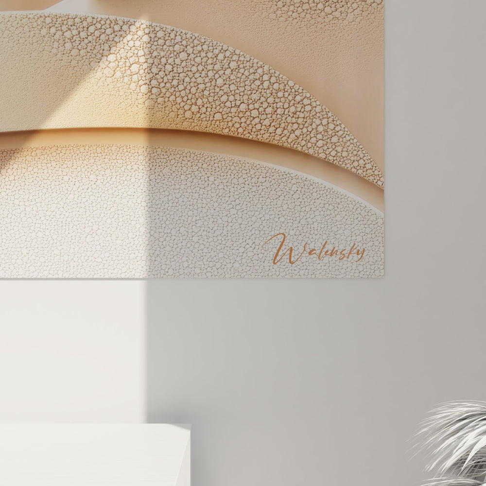Cette création artistique moderne s'inspire des codes esthétiques de l'art zen japonais tout en adoptant un langage visuel contemporain. Elle fait écho aux œuvres de Gustav Klimt par ses textures dorées et rappelle l'art numérique moderne par ses formes géométriques fluides. Ce style hybride crée un art mural zen unique parfait pour les espaces de bien-être.