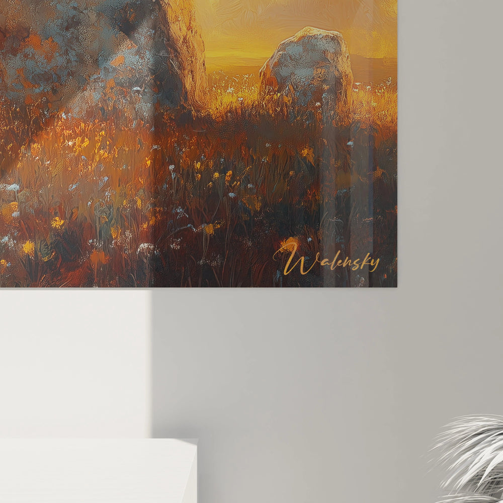 La palette chromatique de ce tableau mégalithe est dominée par une harmonie spectaculaire d'oranges et de jaunes incandescents qui embrasent le ciel et se reflètent sur la prairie. Le contraste est accentué par les tons bleu-gris des pierres mégalithiques, créant une opposition complémentaire qui dynamise l'ensemble de la composition. Les variations subtiles dans les tonalités dorées du ciel créent un effet de profondeur atmosphérique, tandis que les touches de bleu dans les ombres des pierres ajoutent une dimension de mystère.