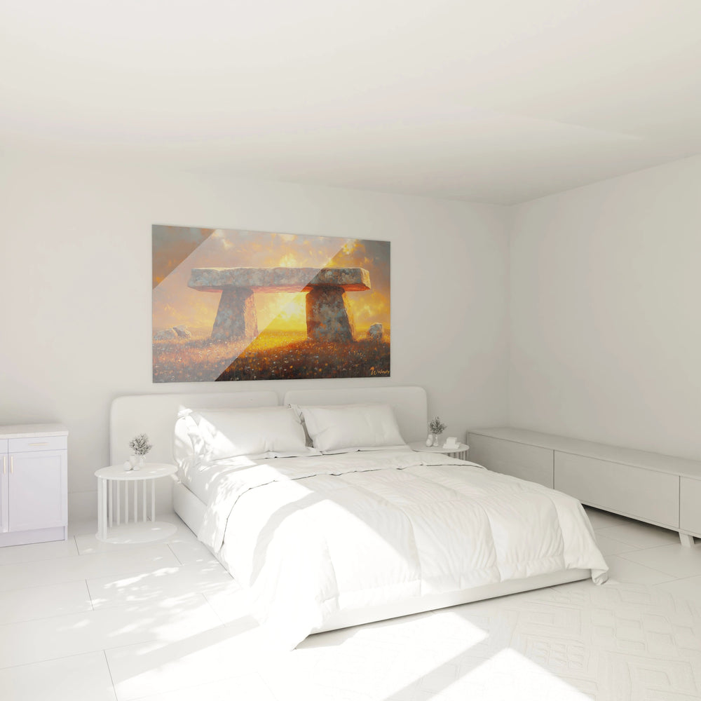 Ce tableau mégalithe captive immédiatement par sa représentation saisissante d'un dolmen ancestral baigné dans la lumière dorée d'un coucher de soleil. L'œuvre présente une structure mégalithique imposante composée de trois pierres massives formant un portail primitif au centre de la composition. La première impression est dominée par le contraste saisissant entre la solidité du monument préhistorique et la douceur éthérée du ciel embrasé. Ce tableau mégalithe se distingue par sa capacité à évoquer simultanément l'ancienneté millénaire et l'éternité cosmique.