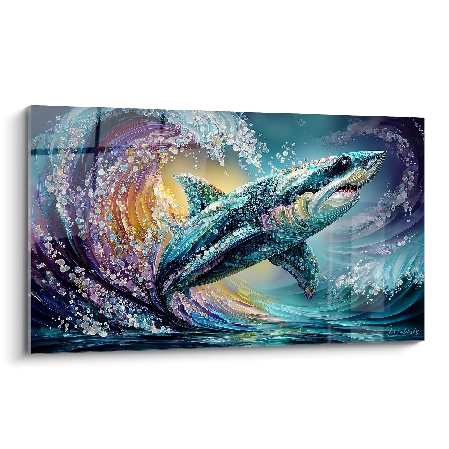 Imaginez-vous en train de contempler ce chef-d'œuvre, où l’énigmatique mégalodon émerge des profondeurs, capturant l'esprit de la puissance et de la grâce. Avec des nuances de bleu profond et des éclats de lumière, chaque détail a été soigneusement pensé pour évoquer l'essor des vagues qui vous portent loin des tracas du quotidien.