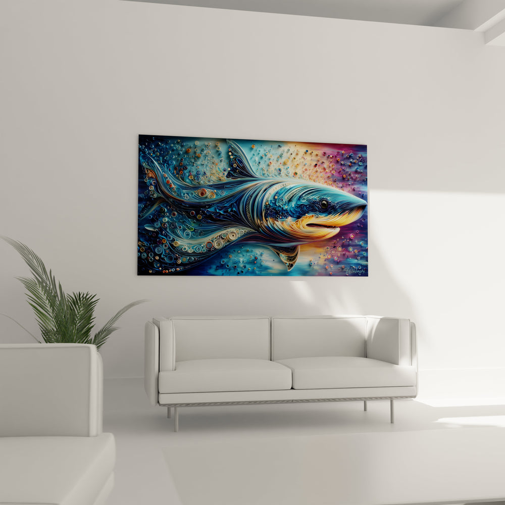 Ce tableau mural Mégalodon stylisée offre une interprétation artistique saisissante du géant des mers dans un style contemporain unique. L'œuvre présente une Mégalodon art moderne aux lignes fluides et organiques, créée avec une technique de superposition de couleurs qui évoque à la fois la puissance et la grâce de ce mammifère marin emblématique. Les détails minutieux de cette décoration murale océan révèlent des motifs circulaires et des ondulations qui rappellent les remous aquatiques et les bulles d'air, créant un effet de mouvement perpétuel. Ce tableau artistique baleine se distingue par son approche novatrice qui transforme l'animal en véritable œuvre d'art décorative, où chaque courbe et chaque nuance participent à l'harmonie générale de la composition. L'artiste a su capturer l'essence même de la vie marine à travers cette peinture baleine contemporaine qui transcende la simple représentation naturaliste pour atteindre une dimension poétique et symbolique profonde.