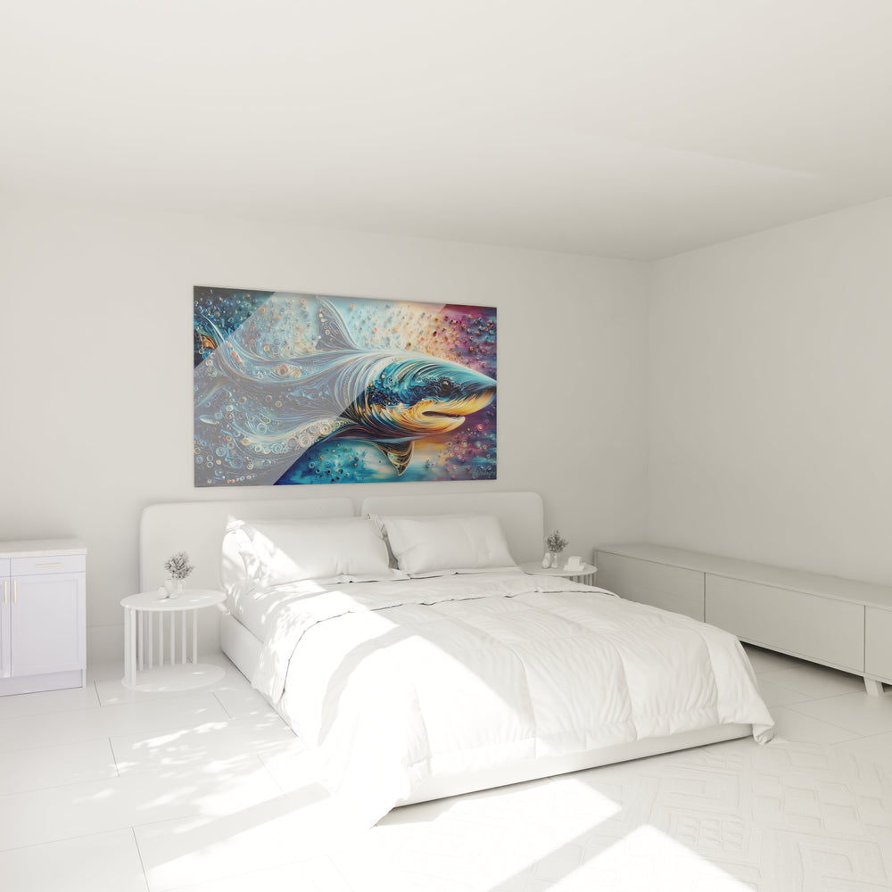 La palette chromatique de ce tableau Mégalodon décoratif évolue du bleu océanique profond vers des tons dorés chaleureux, symbolisant le voyage entre les abysses mystérieuses et la lumière salvatrice. Les nuances violettes et turquoise évoquent la majesté des créatures marines, tandis que les couleurs vibrantes tableau orange et jaune représentent l'énergie vitale et la sagesse ancestrale attribuées aux baleines dans de nombreuses cultures.