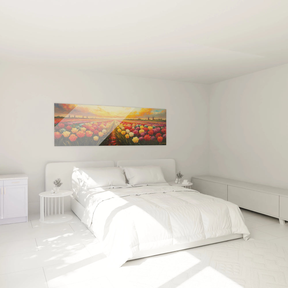 Ce tableau tulipes captive immédiatement par son explosion de couleurs vibrantes qui s'étendent à perte de vue. L'œuvre présente un vaste champ de tulipes multicolores sous un ciel embrasé au coucher du soleil. La composition panoramique offre une vue immersive sur ces rangées de fleurs parfaitement alignées qui créent des lignes de perspective guidant le regard vers l'horizon. Les silhouettes de moulins néerlandais se découpent délicatement contre le ciel flamboyant, ajoutant une dimension culturelle distincte à cette représentation saisissante du patrimoine floral hollandais.