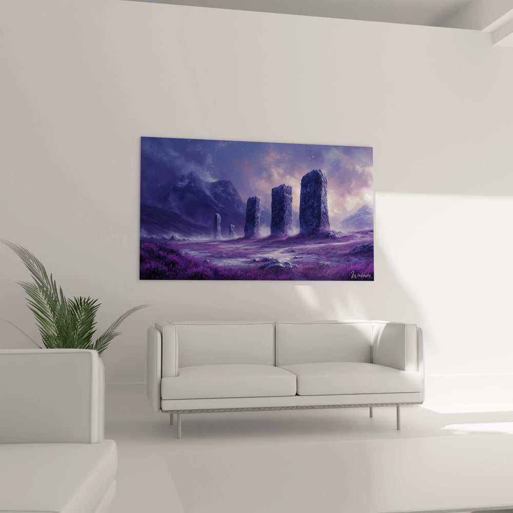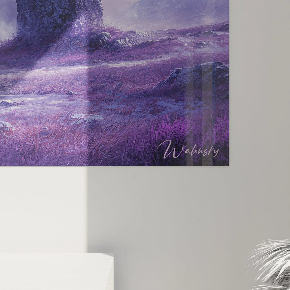 Observer ce tableau monolithes à différentes distances révèle la richesse exceptionnelle de ses détails et de sa composition. De loin, l'œuvre présente une silhouette saisissante et une palette chromatique cohérente qui capture immédiatement l'attention. En s'approchant, les détails subtils commencent à émerger : les textures rugueuses des monolithes, les variations délicates dans les teintes violettes des prairies, et les étoiles minuscules qui parsèment le ciel nocturne. À très courte distance, on découvre les coups de pinceau minutieux qui ont créé les effets de brume, ainsi que les superpositions de couleurs qui donnent vie à cette art mural mystérieux aux teintes violacées.