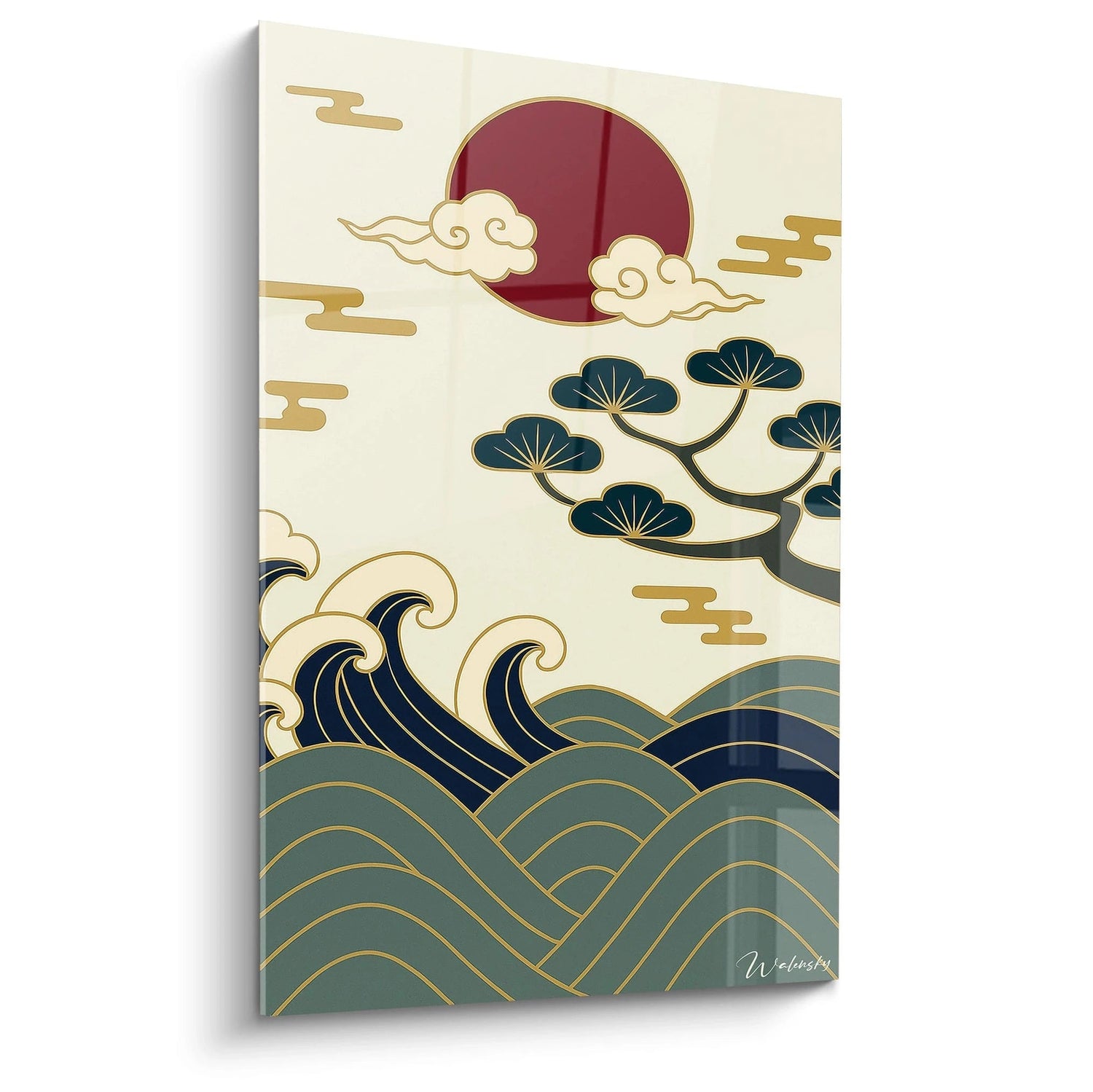 Chaque détail vous transporte dans un univers où la nature et la philosophie s’entrelacent. Imaginez les vagues majestueuses ondulant avec grâce, décorées de touches dorées délicates évoquant la technique millénaire du kintsugi. Le rouge intense du soleil, symbole d’énergie et de renouveau, illumine la scène tandis que les pins stylisés et les nuages flottent avec équilibre, incarnant la notion japonaise d’harmonie entre mouvement et stabilité.