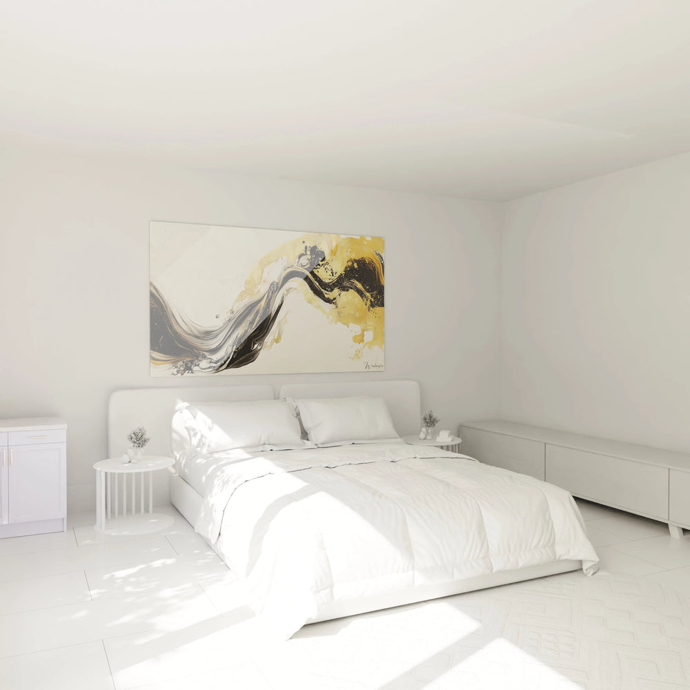 Ce tableau abstrait doré se distingue par ses mouvements fluides et organiques qui créent une symphonie visuelle captivante. Les couleurs dominantes - or, noir et crème - s'entremêlent dans une danse hypnotique qui évoque à la fois la fluidité de l'eau et la richesse du métal précieux. Cette œuvre présente un tableau abstrait moderne doré où chaque courbe raconte une histoire de mouvement et d'émotion. Les éclaboussures et projections spontanées ajoutent une dimension dramatique à l'ensemble, créant des points d'accroche visuels qui maintiennent l'œil du spectateur en constante exploration. L'aspect marbré de certaines zones contraste harmonieusement avec les lignes plus définies, offrant ainsi un tableau abstrait contemporain doré d'une richesse visuelle exceptionnelle.