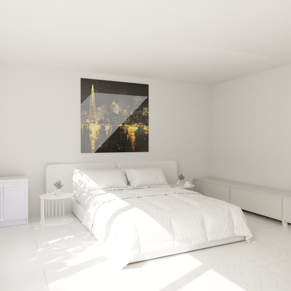 L'unicité de cette œuvre gratte-ciel éclairage nocturne réside dans sa capacité à transformer un paysage urbain familier en vision poétique extraordinaire. Le traitement particulier des reflets aquatiques, qui ne se contentent pas de reproduire fidèlement les bâtiments mais les transforment en abstractions dorées, constitue l'élément distinctif majeur. La signature artistique visible en bas à droite atteste de l'authenticité de cette création originale. Chaque fenêtre illuminée raconte une histoire différente, créant une mosaïque lumineuse d'une complexité fascinante. Cette art mural urbain nocturne se distingue également par son format carré qui concentre l'énergie visuelle et crée un cadrage cinématographique saisissant, impossible à reproduire ou à dupliquer.