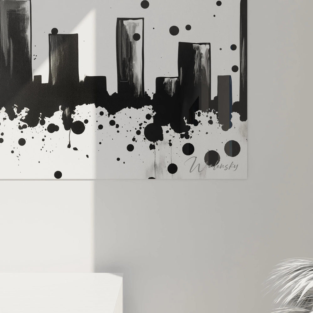 La composition de ce tableau skyline effet éclaboussé s'organise selon une ligne d'horizon claire qui divise l'espace en deux zones distinctes. La partie inférieure accueille la silhouette urbaine avec ses bâtiments de hauteurs variables, créant un rythme visuel ondulant qui guide l'œil de gauche à droite. Les projections d'encre se concentrent principalement dans la zone médiane, créant une transition organique entre les structures architecturales rigides et l'espace négatif supérieur. L'équilibre de cette art mural skyline graphique repose sur la répartition asymétrique mais harmonieuse des masses sombres. Les éclaboussures semblent exploser depuis la base des buildings, suggérant une énergie urbaine qui déborde du cadre strict de l'architecture. Cette organisation spatiale confère à l'ensemble une dynamique ascendante particulièrement expressive.