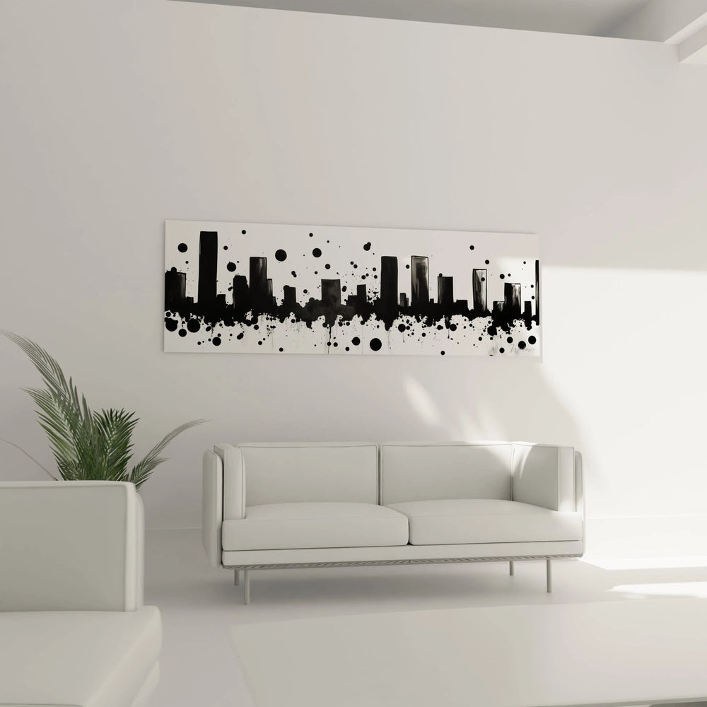 Ce tableau skyline moderne décoratif s'épanouit particulièrement dans des espaces contemporains aux lignes épurées, où son format panoramique peut être pleinement apprécié. Les intérieurs minimalistes avec des murs blancs ou gris clair constituent l'écrin idéal pour cette œuvre monochrome, permettant aux contrastes de s'exprimer pleinement. Un éclairage LED directionnel met en valeur les nuances de gris et amplifie l'effet dramatique des éclaboussures. Cette décoration murale skyline contemporaine trouve sa place naturelle au-dessus d'un canapé dans un salon moderne ou dans un bureau professionnel où elle évoque l'ambition urbaine.