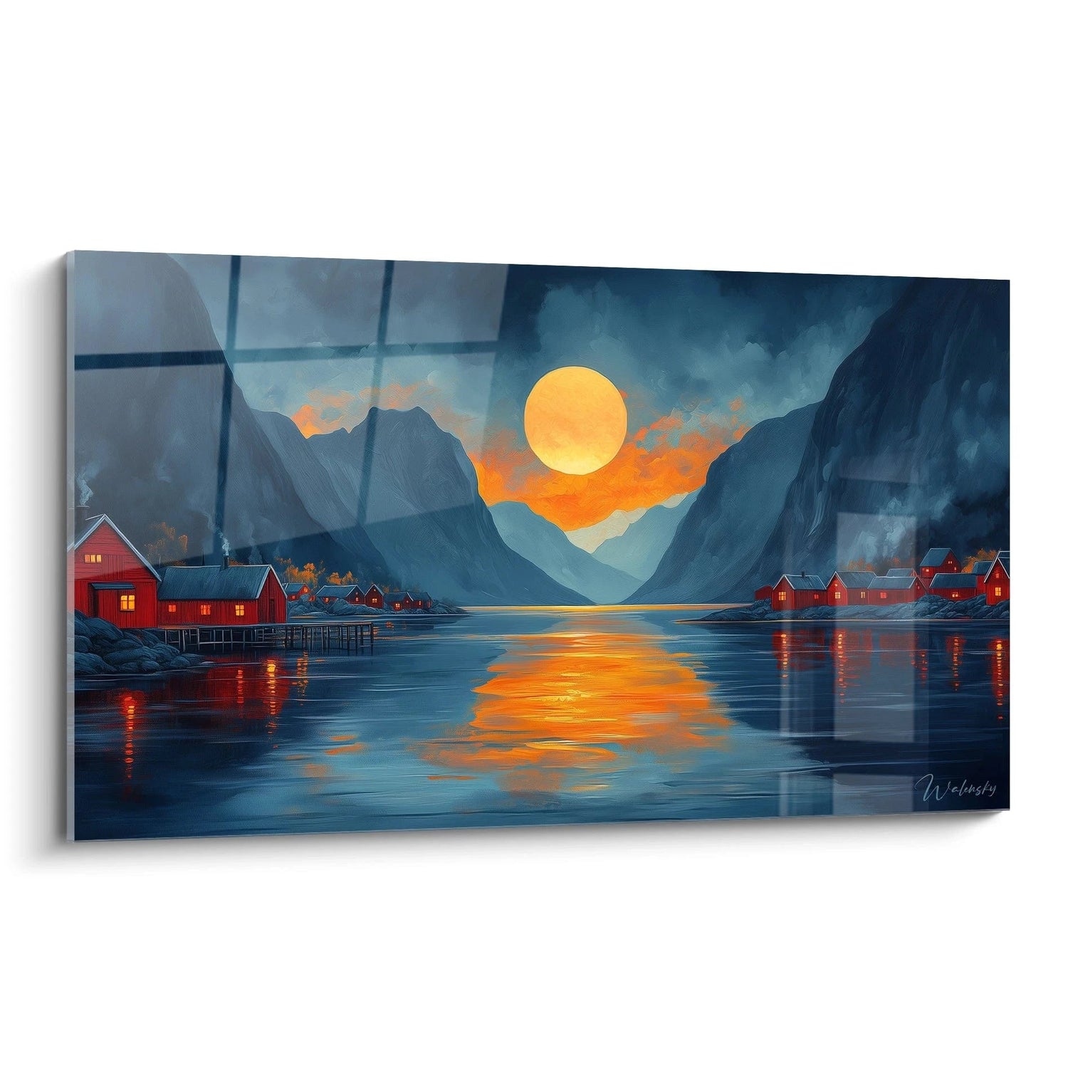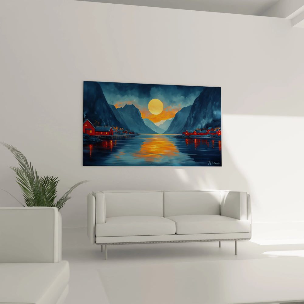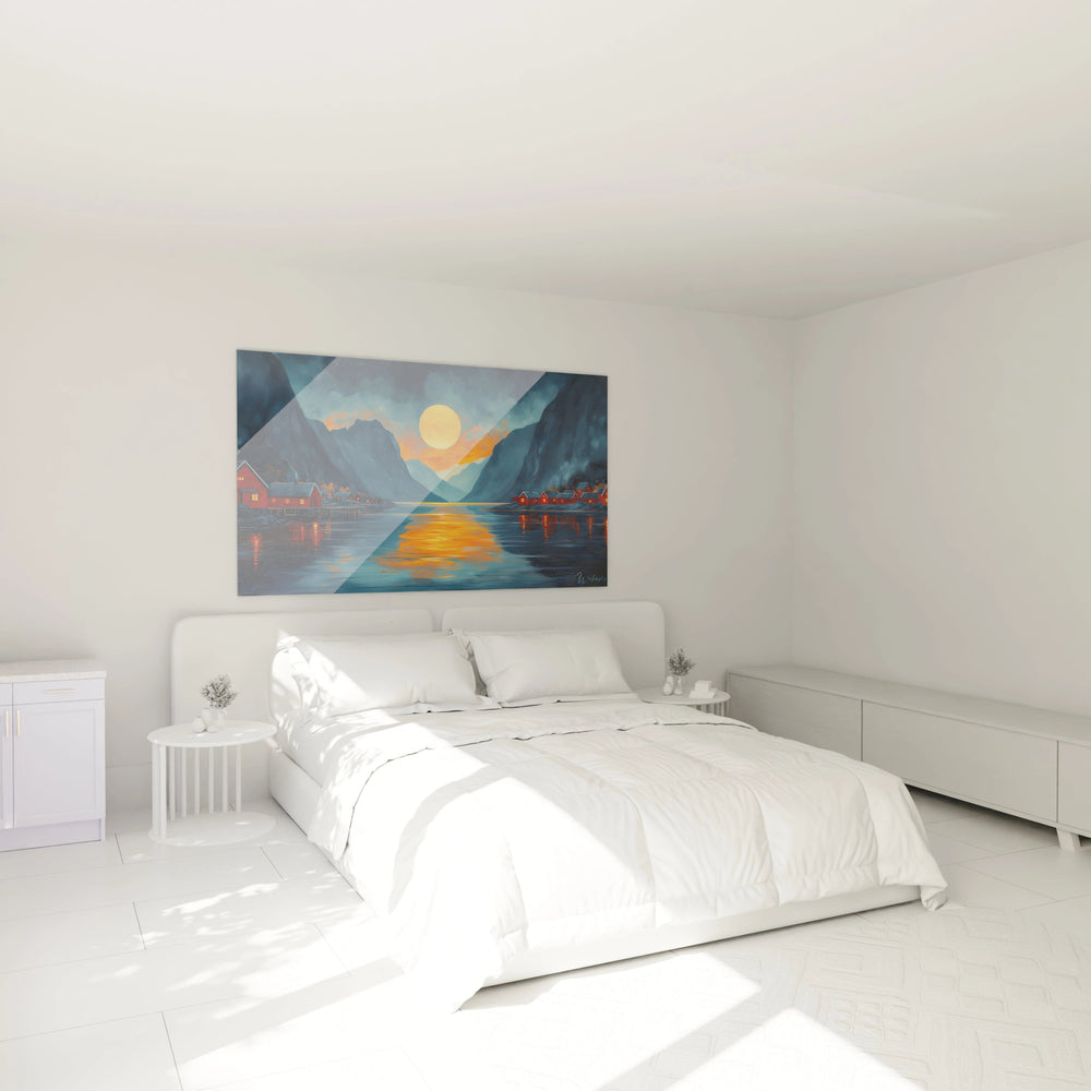 Ce tableau fjord nordique se distingue par sa composition harmonieuse alliant nature sauvage et présence humaine. L'œuvre capture un moment magique où un soleil doré illumine un paysage montagneux enveloppant un fjord aux eaux calmes. Des cabanes rouges traditionnelles parsèment les rives, créant un contraste saisissant avec les tons bleutés dominants. Les reflets orangés du soleil sur l'eau créent un chemin lumineux qui guide le regard à travers la composition, offrant une expérience visuelle immersive entre majesté naturelle et chaleur.